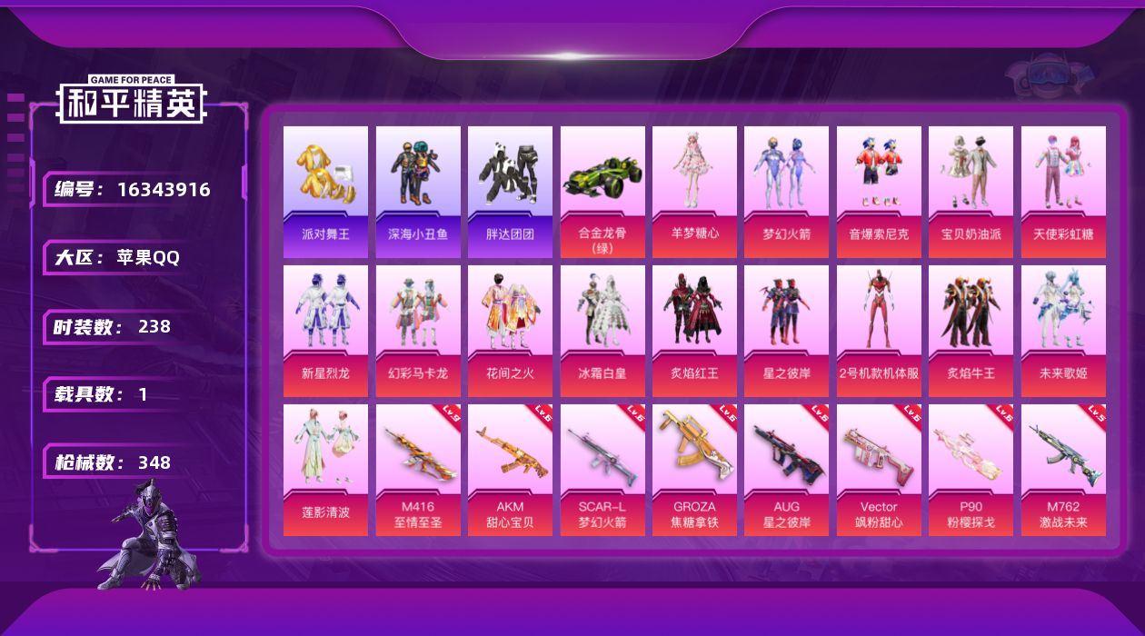 [16343916]苹果 手Q-无敌战神框-15粉装-13特效枪-1载具-4粉色飞行器-108781热力值-22王牌印记-238套装-348枪皮 【热门品类】:粉装-梦幻火箭,粉装-音爆索尼克,套装-浪漫天命,套装-派对舞王,套装-深海小丑鱼,套装-胖达团团,套装-SS1特训,套装-龟仙人,套装-暗影哥特,角色-Mark.06,熔岩游骑兵连帽夹克 【粉色套装】:粉装-宝贝奶油派,粉装-天使彩虹糖,粉装-梦幻火箭,粉装-新星烈龙,粉装-幻彩马卡龙,粉装-花间之火,粉装-冰霜白皇,粉装-炙焰红王,粉装-星之彼岸,角色-2号机款机体服,粉装-炙焰牛王,粉装-音爆索尼克,粉装-未来歌姬,粉装-莲影清波,角色-羊梦糖心 【粉色枪皮等级】:AKM-甜心宝贝(六级),AKM-炫紫旋律(一级),SCAR-L-梦幻火箭(六级),SCAR-L-青春物语(一级),M416-心之恋语(一级),M416-暖熊萌萌(一级),M416-至情至圣(九级),GROZA-焦糖拿铁(六级),AUG-星之彼岸(六级),M762-激战未来(五级),Vector-飒粉甜心(六级),P90-粉樱探戈(六级),MG3-梦幻舞会(五级) 【粉色载具】:合金龙骨(绿) 【粉色枪皮】:AKM-甜心宝贝,AKM-炫紫旋律,SCAR-L-梦幻火箭,SCAR-L-青春物语,M416-心之恋语,M416-暖熊萌萌,M416-至情至圣,GROZA-焦糖拿铁,AUG-星之彼岸,M762-激战未来,Vector-飒粉甜心,P90-粉樱探戈,MG3-梦幻舞会 【粉色飞行器】:梦幻火箭飞行器,暗翼战神飞行器,星之彼岸飞行器,风花雪月飞行器