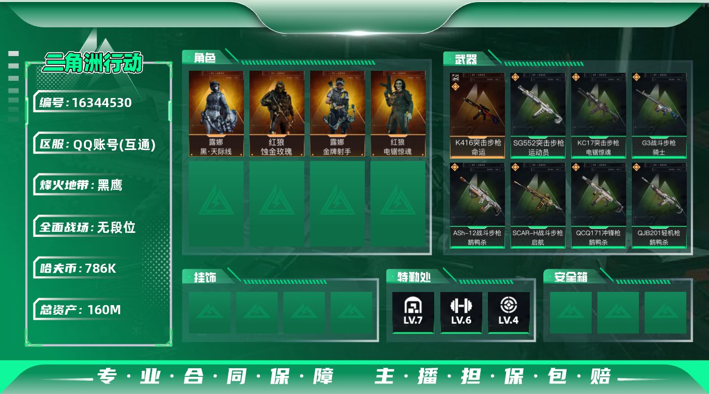 [16344530]【特价出售/店主推荐】160m总资产-786k哈伏币-60烽火等级-黑鹰-2战场等级-无军衔 【干员外观】:红狼-蚀金玫瑰,露娜-黑·天际线,红狼-电锯惊魂,露娜-金牌射手 【近战皮肤】:近战-黑鹰 【典藏外观】:K416突击步枪-命运 【传说外观】:M4A1突击步枪-蚀金玫瑰,M4A1突击步枪-阿米娅,ASh-12战斗步枪-鹅鸭杀,SG552突击步枪-运动员,AK-12突击步枪-特斯拉线圈,SCAR-H战斗步枪-启航,G3战斗步枪-骑士,CAR-15突击步枪-阿米娅,腾龙突击步枪-捞点薯条,KC17突击步枪-电锯惊魂,UZI冲锋枪-特斯拉线圈,SR-3M紧凑突击步枪-特斯拉线圈,勇士冲锋枪-能天使-午夜邮差,QCQ171冲锋枪-鹅鸭杀,M250通用机枪-骑士之心,QJB201轻机枪-鹅鸭杀,AWM狙击步枪-捞点薯条,93R-捞点薯条,复合弓-黑·天际线 【史诗外观】:AWM狙击步枪-私人定制,QBZ95-1突击步枪-曙光,ASh-12战斗步枪-无极限,M16A4突击步枪-竞赛选手,AUG突击步枪-蝮蛇,M7战斗步枪-百步穿杨,SG552突击步枪-深海恐惧,G3战斗步枪-流沙送葬,AS Val突击步枪-典狱官,AS Val突击步枪-百步穿杨,K437突击步枪-守护者,MP5冲锋枪-深海恐惧,MP5冲锋枪-战术竞备,MP5冲锋枪-竞技风,Vector冲锋枪-阿萨拉文明,Vector冲锋枪-百步穿杨,SR-3M紧凑突击步枪-战术竞备,勇士冲锋枪-工业狂潮,MP7冲锋枪-守护者,PKM通用机枪-蝮蛇,Mini-14射手步枪-守护者,SVD狙击步枪-阿萨拉工艺,M14射手步枪-工业狂潮,SV-98狙击步枪-林中猎手,M700狙击步枪-竞技风,M700狙击步枪-百步穿杨,M700狙击步枪-哈夫克警备,AWM狙击步枪-无极限,AWM狙击步枪-流沙送葬,沙漠之鹰-曙光,复合弓-守护者 【稀有外观】:M1014霰弹枪-青纹,M14射手步枪-天际线,M4A1突击步枪-繁盛,AKM突击步枪-战术演练,AKM突击步枪-肃杀,QBZ95-1突击步枪-公平竞技,ASh-12战斗步枪-繁盛,M7战斗步枪-捣蛋鬼,SCAR-H战斗步枪-荣耀列队,SCAR-H战斗步枪-黄昏,G3战斗步枪-战术演练,G3战斗步枪-主宰,PTR-32突击步枪-天网,腾龙突击步枪-冰天雪地,K437突击步枪-天狼星,
