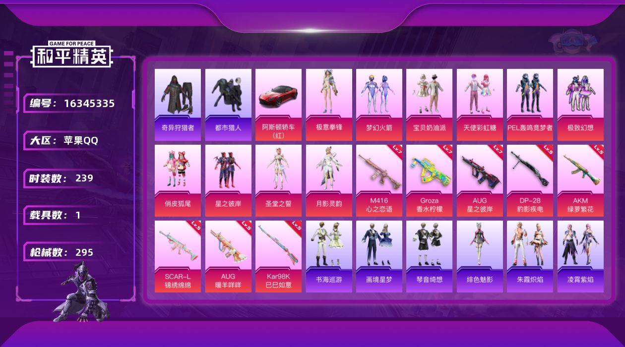 [16345335]【特价出售/店主推荐】 苹果 手Q-10粉装-8特效枪-1载具-6粉色飞行器-98295热力值-14王牌印记-239套装-295枪皮 【热门品类】:粉装-梦幻火箭,套装-浪漫天命,套装-都市猎人,套装-小丑鱼,套装-奇异狩猎者,套装-SS1特训,套装-潮萌小黄鸭,套装-浪漫波比 【粉色套装】:粉装-宝贝奶油派,粉装-天使彩虹糖,粉装-梦幻火箭,粉装-PEL轰鸣竞梦者,粉装-极致幻想,粉装-俏皮狐尾,粉装-星之彼岸,角色-圣堂之誓,角色-月影灵韵,粉装-极意拳锋 【粉色枪皮等级】:AKM-绿萝繁花(五级),SCAR-L-锦绣绵绵(五级),M416-心之恋语(七级),GROZA-香水柠檬(七级),AUG-星之彼岸(七级),AUG-暖羊咩咩(五级),Kar98K-巳巳如意(五级),DP-28-豹影疾电(五级) 【粉色载具】:阿斯顿马丁DBS(红) 【粉色枪皮】:AKM-绿萝繁花,SCAR-L-锦绣绵绵,M416-心之恋语,GROZA-香水柠檬,AUG-星之彼岸,AUG-暖羊咩咩,Kar98K-巳巳如意,DP-28-豹影疾电 【粉色飞行器】:梦幻火箭飞行器,绮梦青鸾飞行器,花傲天飞行器,动力核心飞行器,极意拳锋飞行器 【粉色降落伞】:幻影战神降落伞,百万伏特降落伞,甜心宝贝降落伞,精灵迷巫降落伞,炫紫旋律降落伞,神秘黑猫降落伞,繁花小夜曲降落伞,心之恋语降落伞,荧光虫舞降落伞,星之彼岸降落伞,洛神天依降落伞,萌物绒绒降落伞,莲影清波降落伞,小叽联名款降落伞,英伦信使降落伞,千金淑猫降落伞,临安公主降落伞,幻彩电音降落伞,绯穹魔姬降落伞,异瞳寒姬降落伞,炫彩糖果降落伞 【稀有套装】:套装-巳巳如意,套装-雪国风尚,套装-炫彩糖果,角色-都市丽猫,角色-怀庆长公主,套装-燕燕于飞,套装-鱼渊荷华,套装-星影赞美诗,套装-朱霞炽焰,套装-凌霄紫焰,角色-绯色魅影,套装-书海巡游,套装-画境星梦,套装-琴音绮想 【稀有枪皮】:AUG-冰晶雪宝,AKM-四圣焕新,AKM-夜灯,AKM-奇异狩猎者,AKM-彩虹符号,AKM-影袭,AKM-星之彼岸,AKM-春暖花开,AKM-环太平洋,AKM-生命誓言,AKM-阿狸红,AKM-霓虹街区,M16A4-幻世战舞者,M16A4-生命誓言,M16A4-红色方程式,SCAR-L-夏日绵绵冰,SCAR-L-炫彩节奏,SCAR-L-生命誓言,SCAR