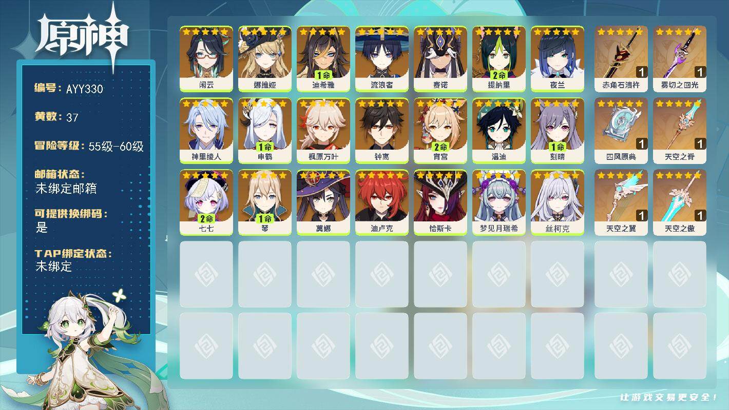 [16347014]【店主推荐捡漏号】60级/37黄/女主/21个五星角色/6个五星武器 0命闲云,0命娜维娅,1命迪希雅,0命流浪者,0命赛诺,2命提纳里,0命夜兰,0命神里绫人,1命申鹤,0命枫原万叶,0命钟离,2命宵宫,0命温迪,1命刻晴,2命七七,1命琴,0命莫娜,0命迪卢克,0命恰斯卡,0命梦见月瑞希,0命丝柯克,精1赤角石溃杵,精1雾切之回光,精1四风原典,精1天空之脊,精1天空之翼,精1天空之傲