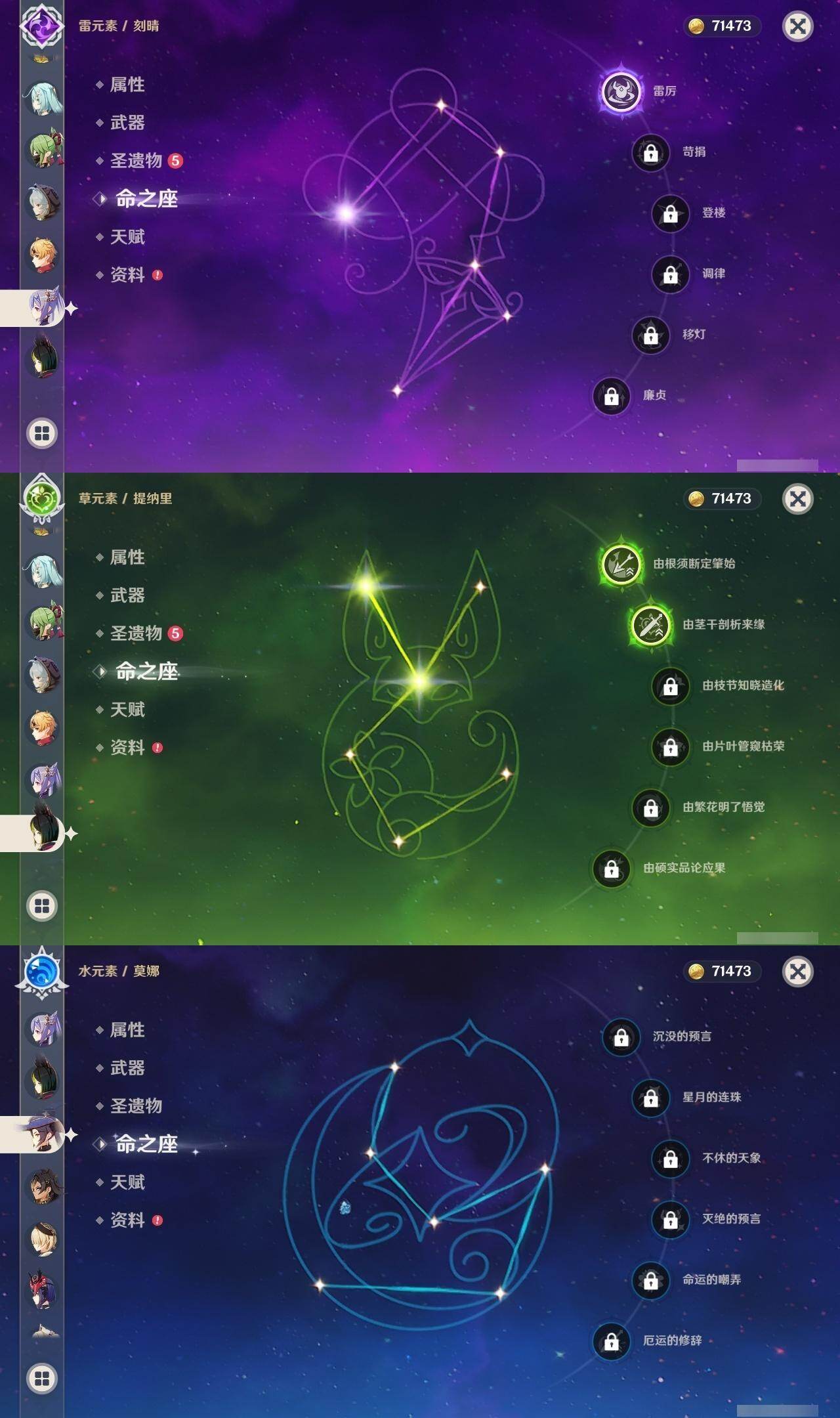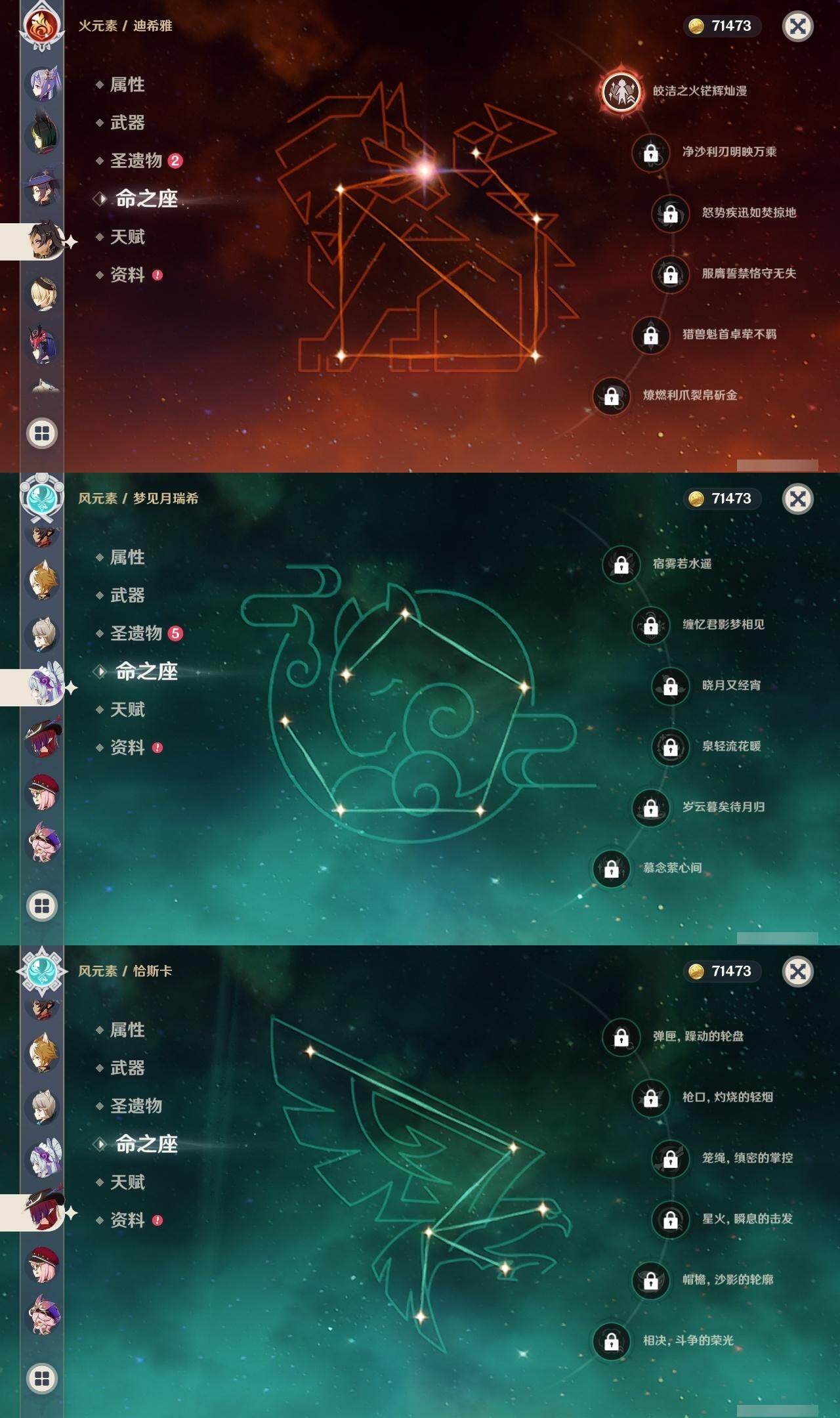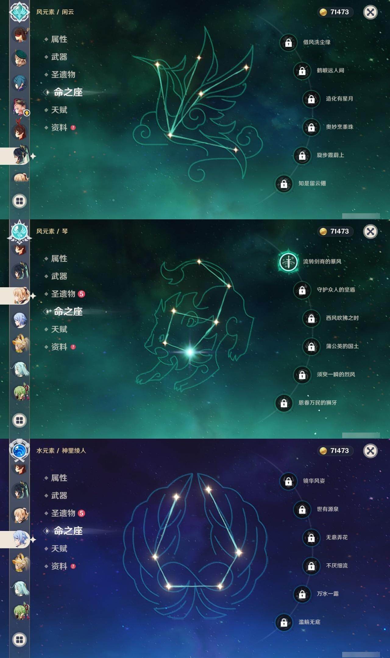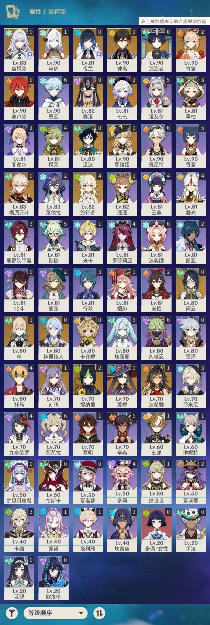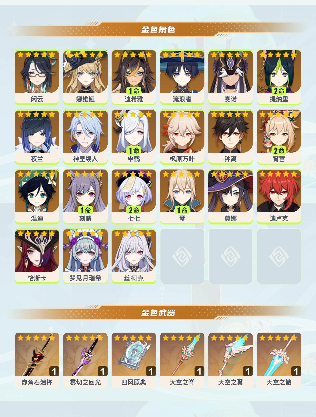 0命闲云,0命娜维娅,1命迪希雅,0命流浪者,0命赛诺,2命提纳里,0命夜兰,0命神里绫人,1命申鹤,0命枫原万叶,0命钟离,2命宵宫,0命温迪,1命刻晴,2命七七,1命琴,0命莫娜,0命迪卢克,0命恰斯卡,0命梦见月瑞希,0命丝柯克,精1赤角石溃杵,精1雾切之回光,精1四风原典,精1天空之脊,精1天空之翼,精1天空之傲