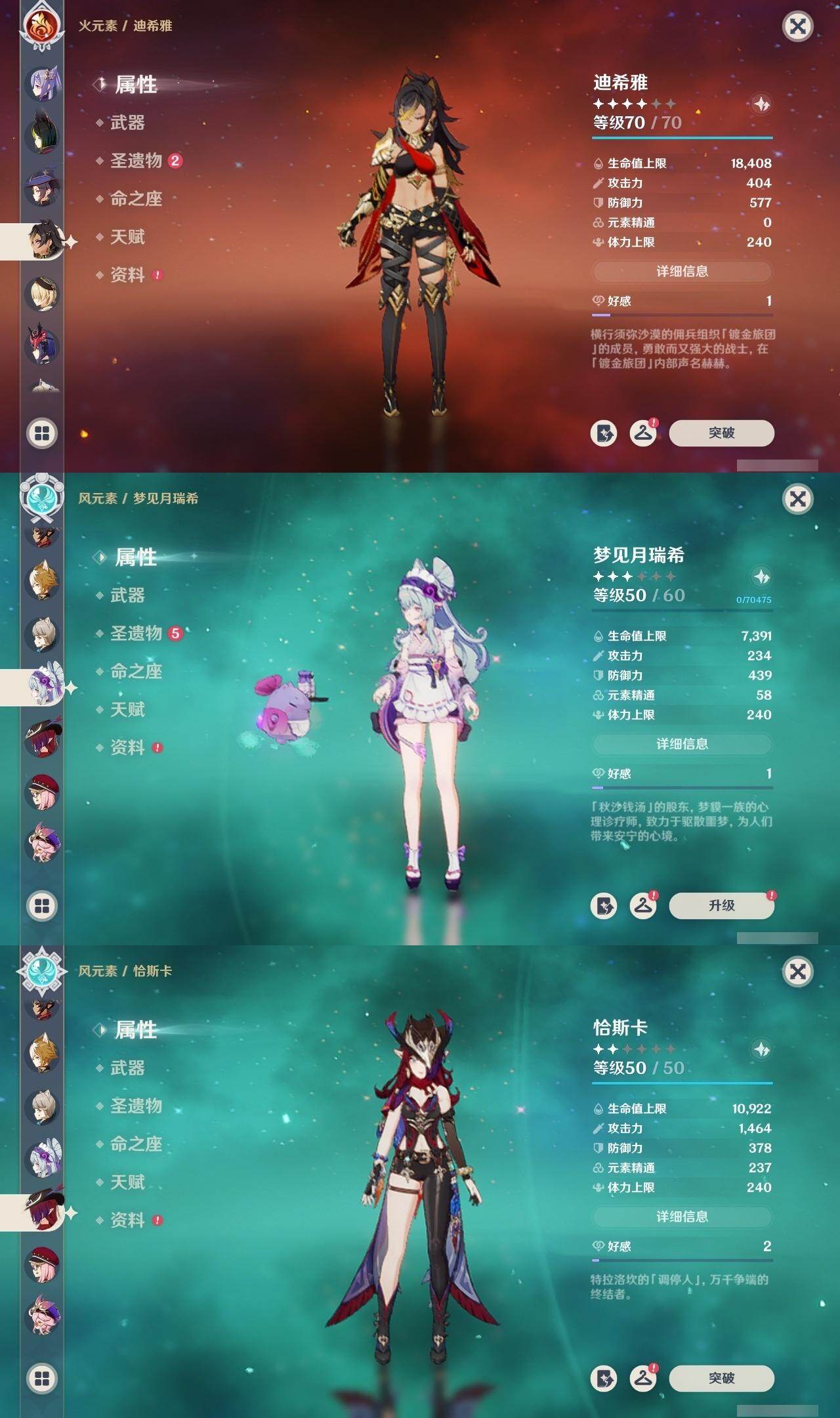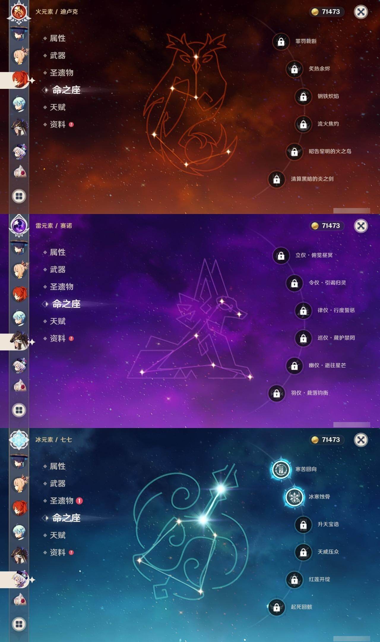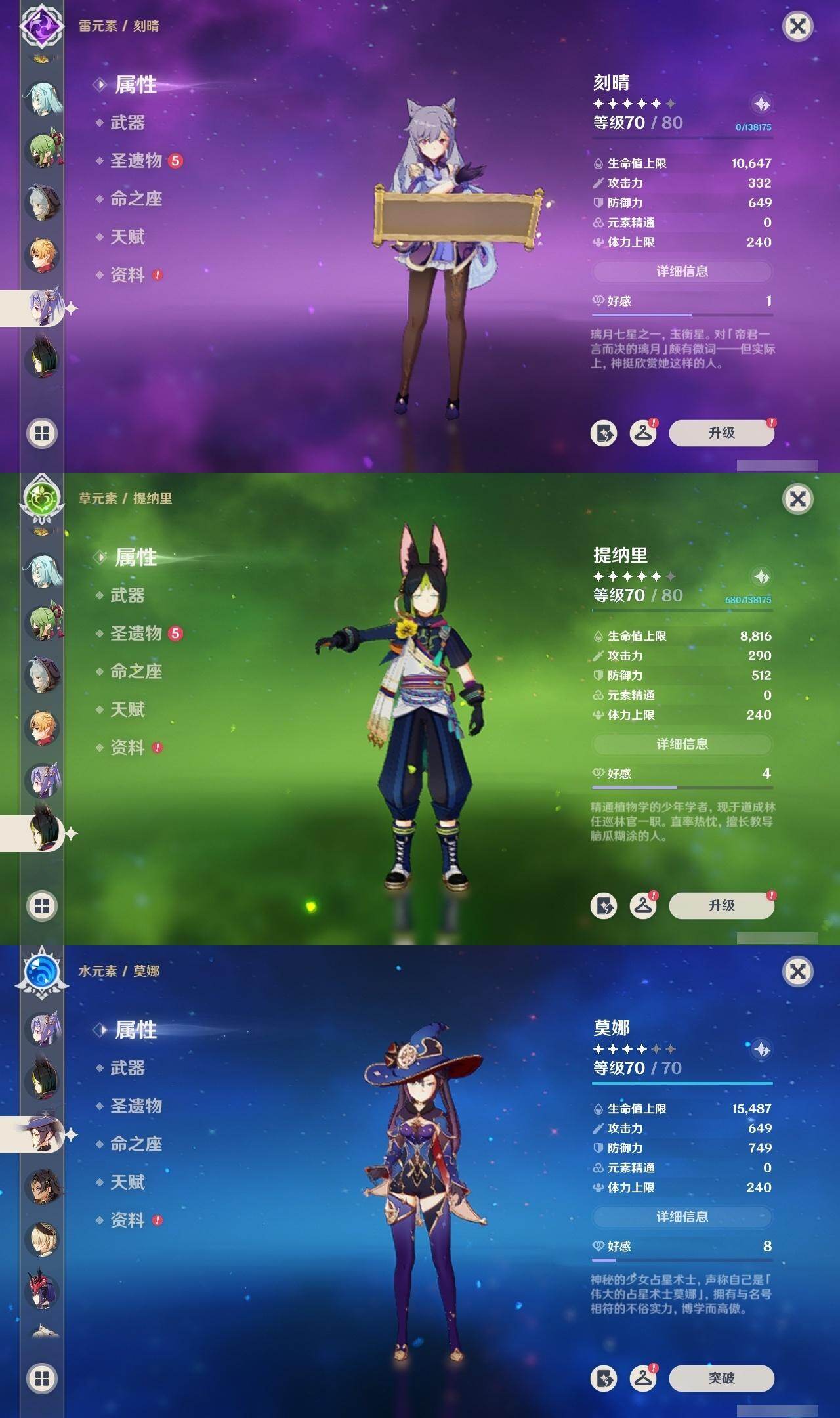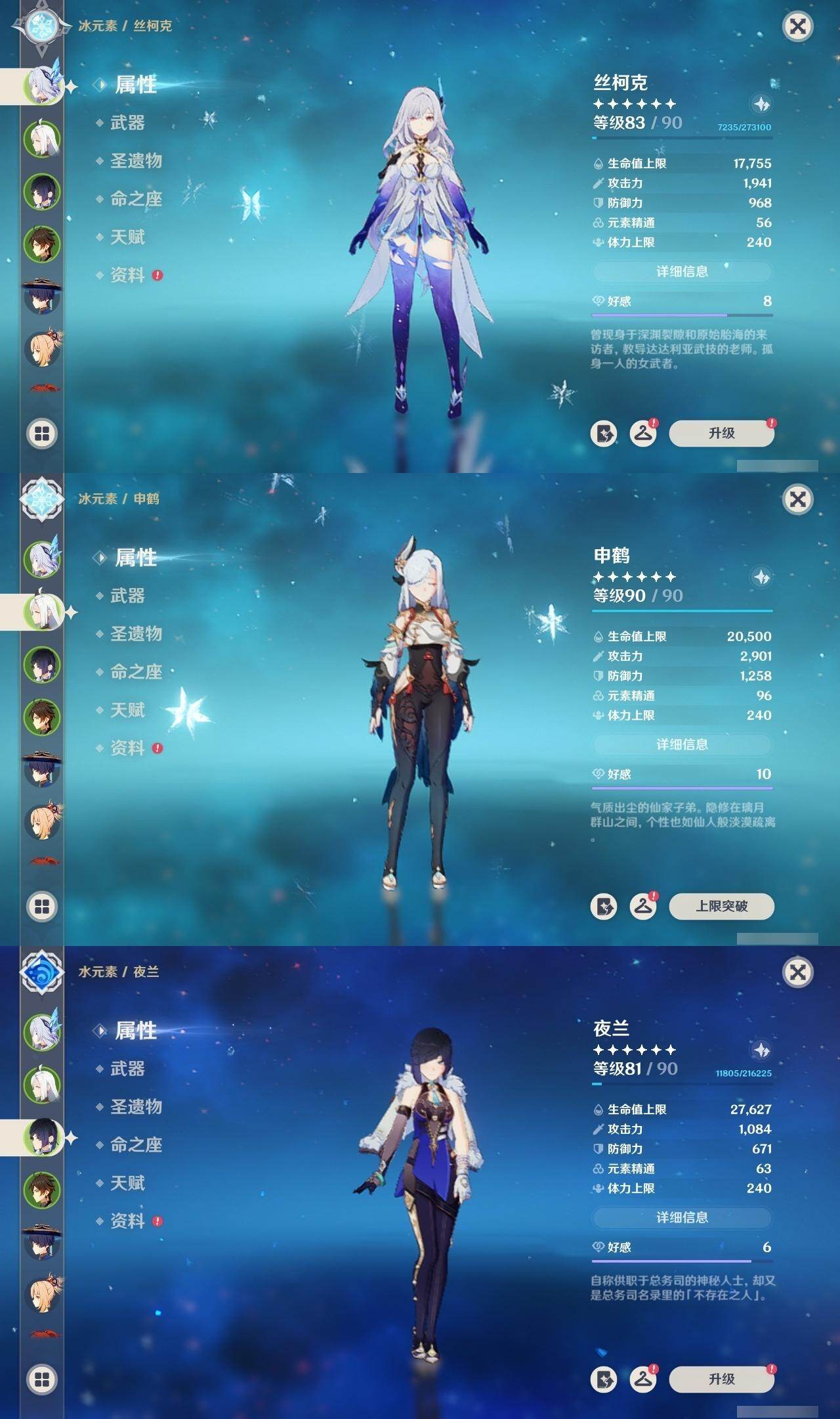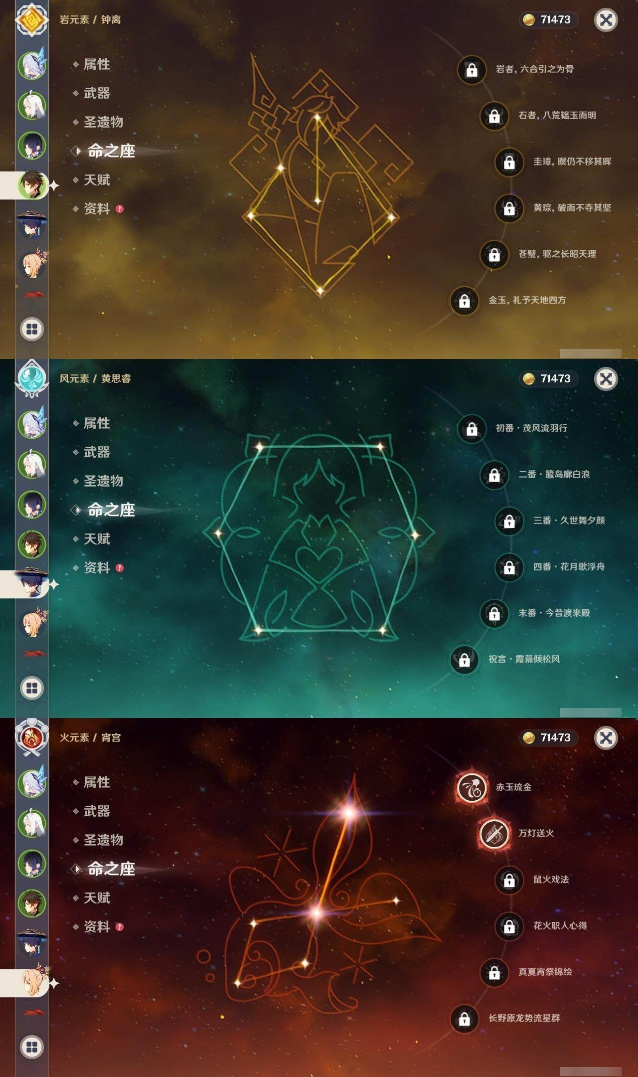 0命闲云,0命娜维娅,1命迪希雅,0命流浪者,0命赛诺,2命提纳里,0命夜兰,0命神里绫人,1命申鹤,0命枫原万叶,0命钟离,2命宵宫,0命温迪,1命刻晴,2命七七,1命琴,0命莫娜,0命迪卢克,0命恰斯卡,0命梦见月瑞希,0命丝柯克,精1赤角石溃杵,精1雾切之回光,精1四风原典,精1天空之脊,精1天空之翼,精1天空之傲