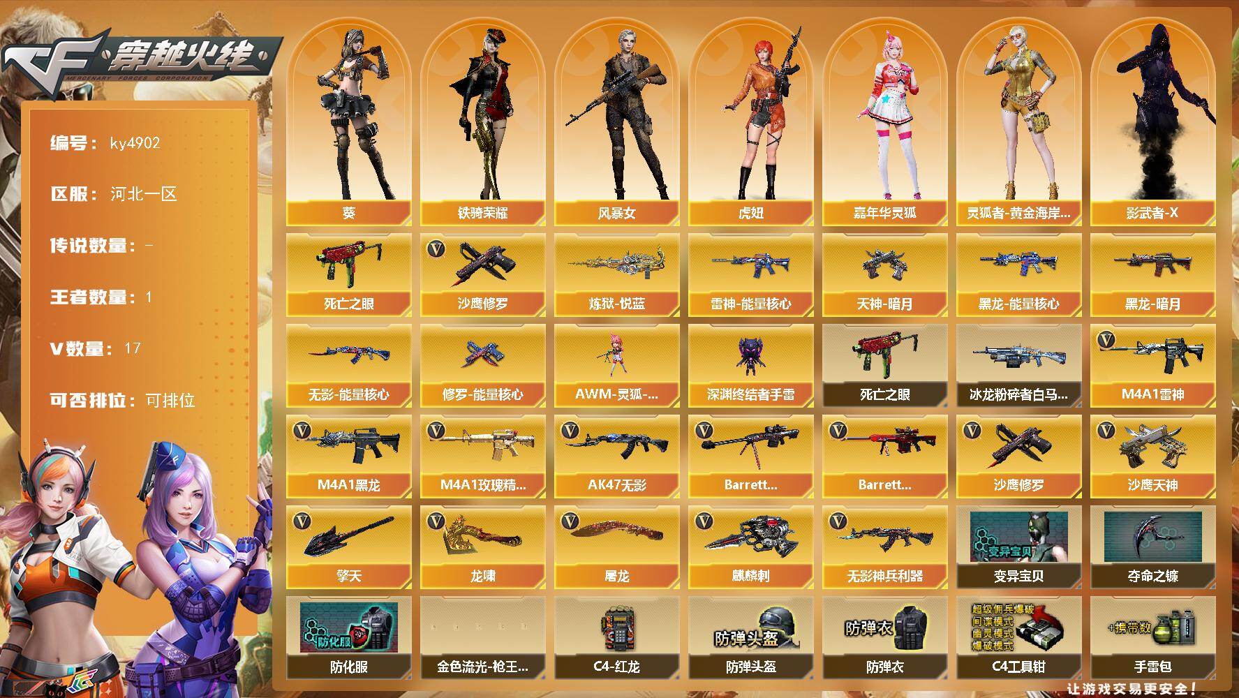 [16347774]河北一区-17V-1王者-0炫金 【热门武器】:死亡之眼,沙鹰-修罗 【王者炫金武器】:炼狱-悦蓝 【皮肤】:雷神-能量核心,黑龙-能量核心,黑龙-暗月*2,无影-能量核心,修罗-能量核心*3,天神-暗月 【角色】:葵,风暴女,虎妞,嘉年华灵狐,灵狐者-黄金海岸,铁骑荣耀,影武者-X 【人偶武器】:AWM-灵狐-15周年嘉年华,深渊终结者手雷 【暴走生化】:死亡之眼 【挑战大师】:冰龙粉碎者-白马银枪 【英雄级武器】:M4A1-黑龙,M4A1-雷神,AK47-无影,无影-神兵利器,M4A1-玫瑰精灵,Barrett-毁灭,Barrett-极光*2,沙鹰-修罗,沙鹰-天神*2,屠龙*2,龙啸,擎天,麒麟刺 【道具】:变异宝贝,夺命之镰,防化服,金色流光-枪王排位*2,C4-红龙,防弹头盔*3,防弹衣*3,C4工具钳*3,手雷包*3 【特殊枪械】: