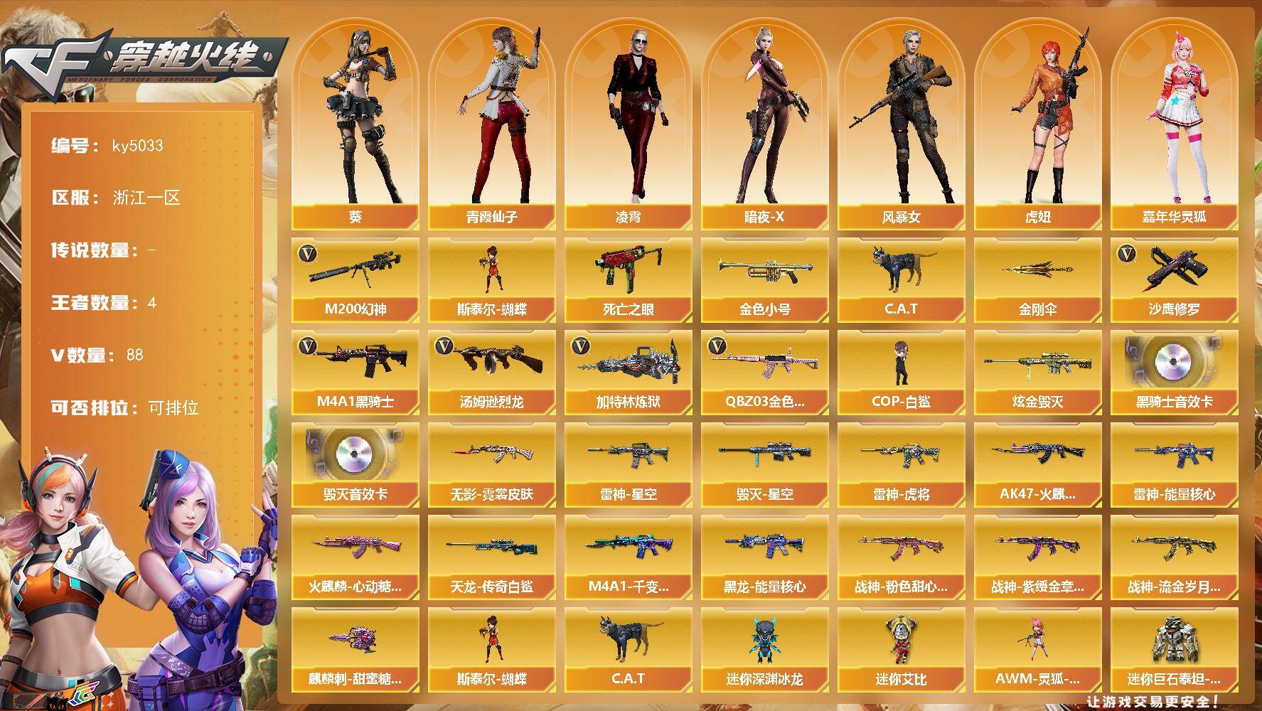 [16348450]浙江一区-88V-4王者-1炫金 【热门武器】:QBZ03-金色蔷薇,M200-幻神,死亡之眼,金色小号,C.A.T,M4A1-黑骑士,汤姆逊-烈龙*5,加特林-炼狱,斯泰尔-蝴蝶,COP-白鲨,沙鹰-修罗*4,金刚伞 【王者炫金武器】:炫金毁灭 【音效卡】:M4A1-黑骑士音效卡,Barrett-毁灭音效卡 【皮肤】:雷神-能量核心,雷神-星空,雷神-虎将,AK47-火麒麟-传奇EVEN,火麒麟-心动糖果,毁灭-星空,M4A1-千变-孔明皮肤,黑龙-能量核心,无影-霓裳皮肤,战神-粉色甜心皮肤*3,战神-紫绶金章皮肤*4,战神-流金岁月皮肤,AWM-天龙-传奇白鲨*2,麒麟刺-甜蜜糖果 皮肤 【角色】:葵,凌霄,暗夜-X,风暴女,虎妞,嘉年华灵狐,灵狐者-黄金海岸,潘多拉-X,青霞仙子,斯沃特-X,兔囡囡,新娜塔莎,影武者-X 【人偶武器】:COP-白鲨,斯泰尔-蝴蝶,AWM-灵狐-15周年嘉年华,C.A.T,迷你深渊冰龙*2,迷你波特博士,生化手雷-机甲核心*2,迷你艾比,迷你巨石泰坦-魔花研究所 【暴走生化】:死亡之眼,超级对讲机 【挑战大师】:神圣爆裂者III,AK47-冰龙粉碎者,激光毁灭者III-白马银枪,VEPR-12-金魔*4,激光毁灭者III 【英雄级武器】:AK47-火麒麟*2,M4A1-黑龙,M4A1-雷神*3,M4A1-黑骑士,AK47-无影*4,AK47-黑武士,AN94-超新星,AK47-黑鲨,M4A1-夜魔,无影-神兵利器,QBZ03-金色蔷薇,王者之魄-觉醒版,AK-47-猩红传说*6,AK47-B-战神,AWM-天龙*2,Barrett-毁灭*2,AWM-裁决,M200-幻神,Barrett-金色蔷薇*2,加特林-炼狱,炼狱-悦蓝-觉醒版,汤姆逊-烈龙*5,沙鹰-修罗*4,沙鹰-天神,破空枪刃-夜魔,USP-神工天巧,王者之灵-觉醒版,屠龙,龙啸,马来剑-夜魔,擎天,麒麟刺,斩神刀-雷暴,王者之击-觉醒版,高爆手雷-雷霆,高爆手雷-雷暴*3,高爆手雷-夜魔*7,闪光弹-雷霆,闪光弹-雷暴*3,闪光弹-夜魔*7,烟雾弹-雷霆,烟雾弹-雷暴*3,烟雾弹-夜魔*7 【道具】:全能枪王背包,炫彩背包,超级背包,绿色巨人,灵魂忍者*3,变异宝贝,妖姬,迷雾幽灵,生化弹匣,夺命之镰*2,防化服*4,金色流光-枪王排位*2,星辰流光-枪王排位,