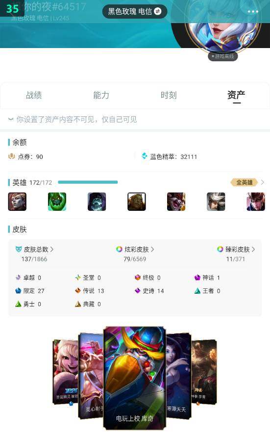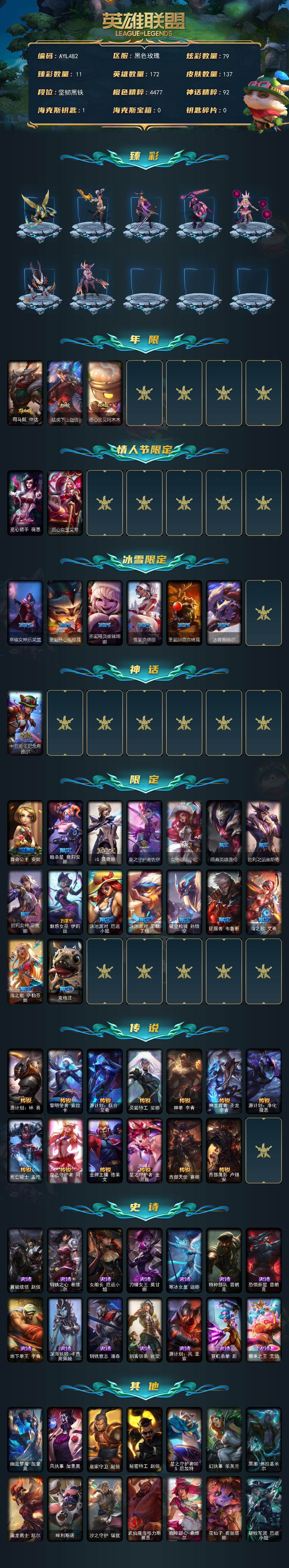 未定级段位-172英雄-137皮肤-79炫彩-0终极-1神话-27限定-13传说-14史诗