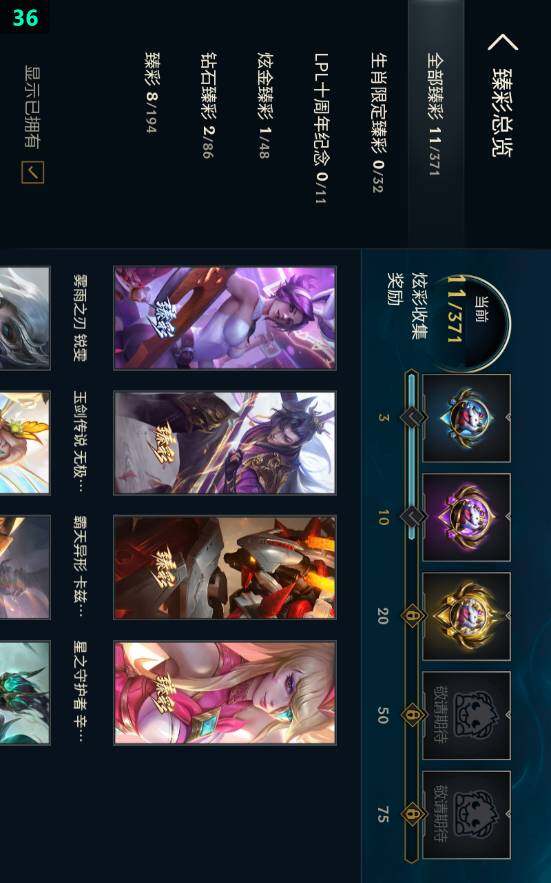 【臻彩皮肤】:冠军掠夺者卡兹克凯旋圣装,雾雨之刃锐雯,花仙子拉克丝纹白,玉剑传说无极麒麟,源计划毁灭派克幻灭,星之守护者辛德拉未来之光,霸天异形卡兹克刹那银光,破败军团厄运小姐灵岛征伐使,魔女阿卡丽虚荣,黑夜使者嘉文四世白夜