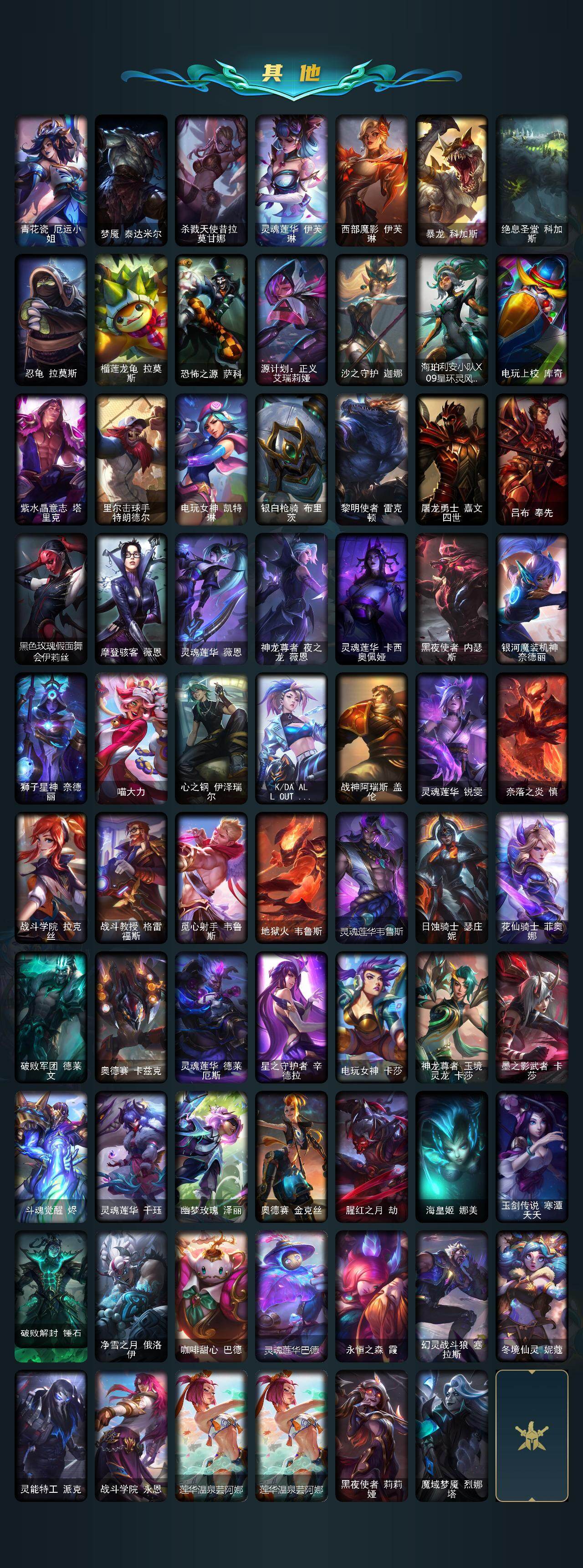 【其他皮肤1】:幽蓝梦魇加里奥,风执事加里奥,皇家守卫赵信,秘密特工赵信,星之守护者COS厄加特,幻执事乐芙兰,黑潮弗拉基米尔,屠龙勇士凯尔,哞利斯塔,沙之守护瑞兹,武仙座海格力斯赛恩,咖啡甜心希维尔,花仙子崔丝塔娜,破败军团厄运小姐,青花瓷厄运小姐,梦魇泰达米尔,杀戮天使昔拉莫甘娜,灵魂莲华伊芙琳,西部魔影伊芙琳,暴龙科加斯,绝息圣堂科加斯,忍龟拉莫斯,榴莲龙龟拉莫斯,恐怖之源萨科,源计划正义艾瑞莉娅,沙之守护迦娜,海珀利安小队X09星环灵风迦娜,电玩上校库奇,紫水晶意志塔里克,里尔击球手特朗德尔,电玩女神凯特琳,银白枪骑布里茨,黎明使者雷克顿,屠龙勇士嘉文四世,吕布奉先,黑色玫瑰假面舞会伊莉丝,摩登骇客薇恩,灵魂莲华薇恩,神龙尊者夜之龙薇恩,灵魂莲华卡西奥佩娅,黑夜使者内瑟斯,银河魔装机神奈德丽,狮子星神奈德丽,喵大力,