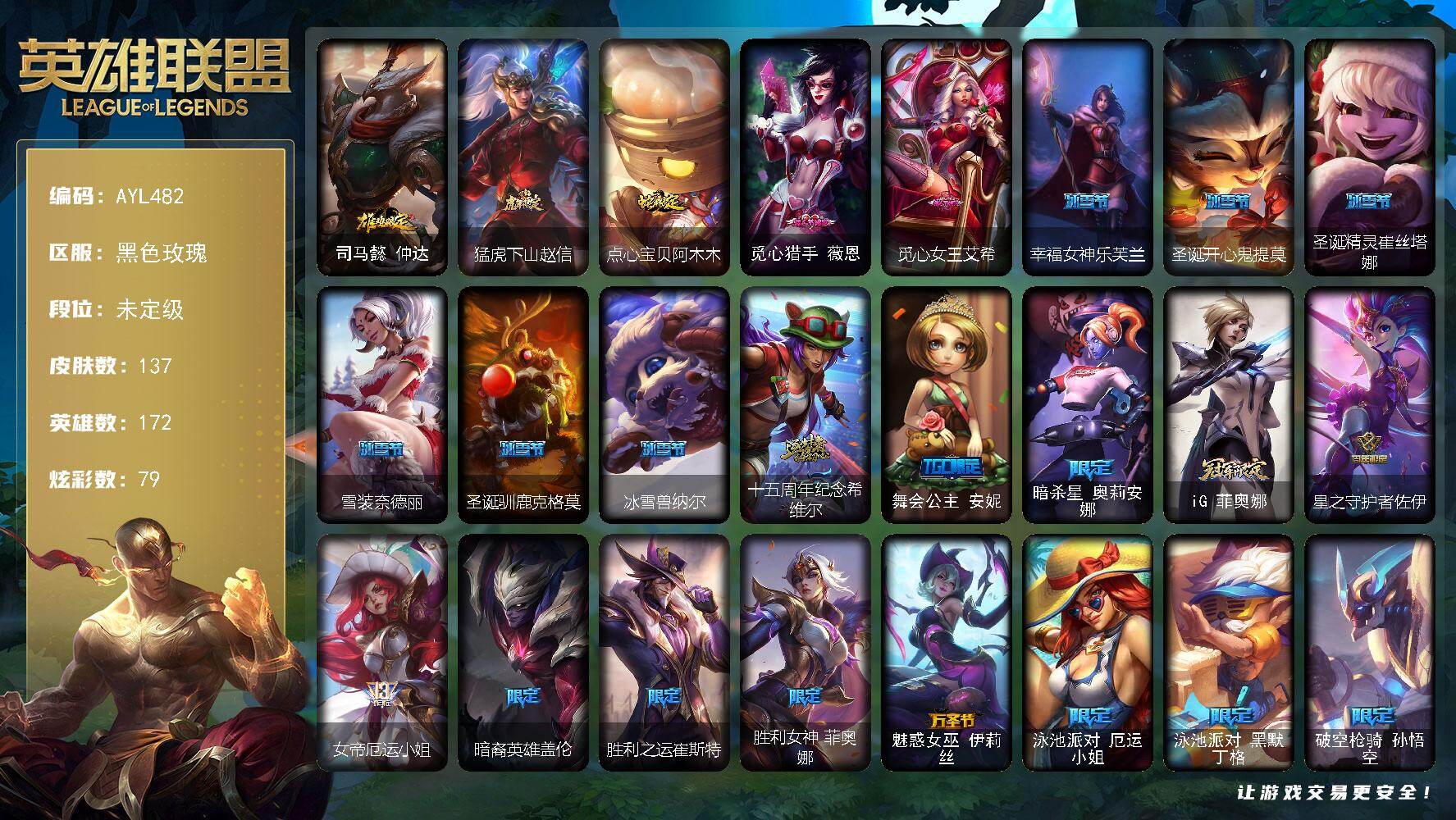 [16353832]【特价出售/店主推荐】 未定级段位-172英雄-137皮肤-79炫彩-0终极-1神话-27限定-13传说-14史诗 【臻彩皮肤】:冠军掠夺者卡兹克凯旋圣装,雾雨之刃锐雯,花仙子拉克丝纹白,玉剑传说无极麒麟,源计划毁灭派克幻灭,星之守护者辛德拉未来之光,霸天异形卡兹克刹那银光,破败军团厄运小姐灵岛征伐使,魔女阿卡丽虚荣,黑夜使者嘉文四世白夜 【年限皮肤】:司马懿仲达,猛虎下山赵信,点心宝贝阿木木 【情人节限定】:觅心猎手薇恩,觅心女王艾希 【冰雪限定】:幸福女神乐芙兰,圣诞开心鬼提莫,圣诞精灵崔丝塔娜,雪装奈德丽,圣诞驯鹿克格莫,冰雪兽纳尔 【神话皮肤】:十五周年纪念希维尔 【限定皮肤】:舞会公主安妮,暗杀星奥莉安娜,iG菲奥娜,星之守护者佐伊,女帝厄运小姐,暗裔英雄盖伦,胜利之运崔斯特,胜利女神菲奥娜,魅惑女巫伊莉丝,泳池派对厄运小姐,泳池派对黑默丁格,破空枪骑孙悟空,征服者韦鲁斯,海之歌艾希,海之歌萨勒芬妮,克格汪 【传说皮肤】:源计划林易,黎明使者索拉卡,源计划联合艾希,灵能特工娑娜,神拳李青,神龙尊者圣龙李青,源计划净化薇恩,死亡骑士盖伦,星之守护者阿狸,金牌主播德莱文,星之守护者金克丝,西部天使赛娜,西部魔影卢锡安 【史诗皮肤】:翼骑统领赵信,钢铁之心希维尔,女船长厄运小姐,刀锋女王莫甘娜,寒冰女皇迦娜,特种部队普朗克,恐惧新星普朗克,地下拳王李青,深海妖姬卡西奥佩娅,钢铁意志潘森,刺客信条锐雯,源计划风亚索,霓虹杀拳蔚,糖果之王艾翁 【其他皮肤1】:幽蓝梦魇加里奥,风执事加里奥,皇家守卫赵信,秘密特工赵信,星之守护者COS厄加特,幻执事乐芙兰,黑潮弗拉基米尔,屠龙勇士凯尔,哞利斯塔,沙之守护瑞兹,武仙座海格力斯赛恩,咖啡甜心希维尔,花仙子崔丝塔娜,破败军团厄运小姐,青花瓷厄运小姐,梦魇泰达米尔,杀戮天使昔拉莫甘娜,灵魂莲华伊芙琳,西部魔影伊芙琳,暴龙科加斯,绝息圣堂科加斯,忍龟拉莫斯,榴莲龙龟拉莫斯,恐怖之源萨科,源计划正义艾瑞莉娅,沙之守护迦娜,海珀利安小队X09星环灵风迦娜,电玩上校库奇,紫水晶意志塔里克,里尔击球手特朗德尔,电玩女神凯特琳,银白枪骑布里茨,黎明使者雷克顿,屠龙勇士嘉文四世,吕布奉先,黑色玫瑰假面舞会伊莉丝,摩登骇客薇恩,灵魂莲华薇恩,神龙尊者夜之龙薇恩,灵魂莲华卡西奥佩娅,黑夜使者内瑟斯,银河魔装机神奈德丽,狮子星神奈德丽,喵大力,