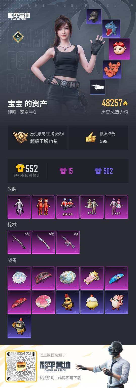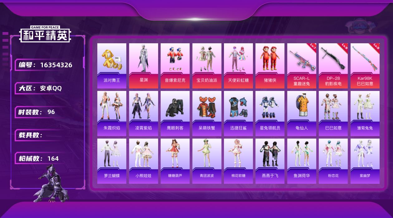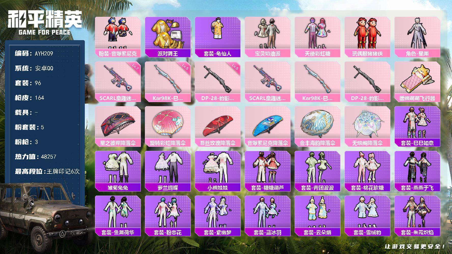 [16354326]安卓 手Q-5粉装-3特效枪-0载具-1粉色飞行器-48257热力值-6王牌印记-96套装-164枪皮 【热门品类】:粉装-音爆索尼克,套装-派对舞王,套装-龟仙人 【粉色套装】:粉装-宝贝奶油派,粉装-天使彩虹糖,粉装-音爆索尼克,玩偶服-猪猪侠,角色-星渊 【粉色枪皮等级】:SCAR-L-童趣迷兔(七级),Kar98K-巳巳如意(五级),DP-28-豹影疾电(五级) 【粉色枪皮】:SCAR-L-童趣迷兔,Kar98K-巳巳如意,DP-28-豹影疾电 【粉色飞行器】:暖熊萌萌飞行器