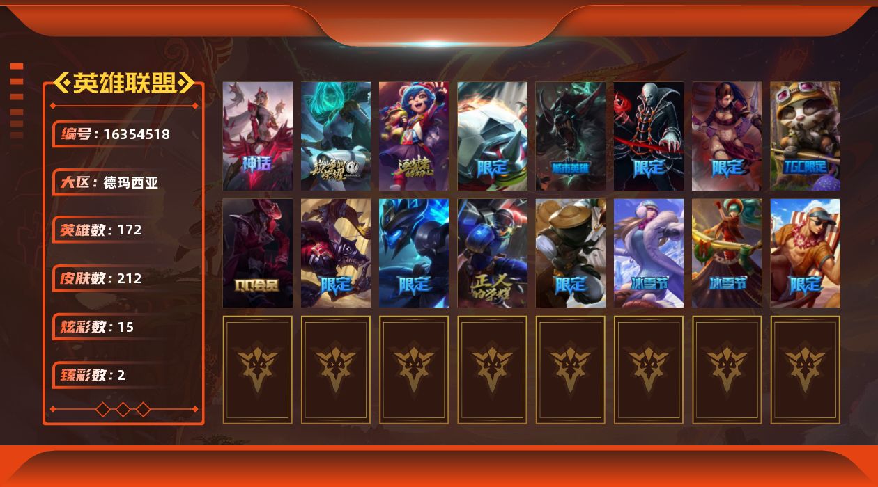 未定级段位-172英雄-212皮肤-15炫彩-0终极-3神话-17限定-25传说-59史诗