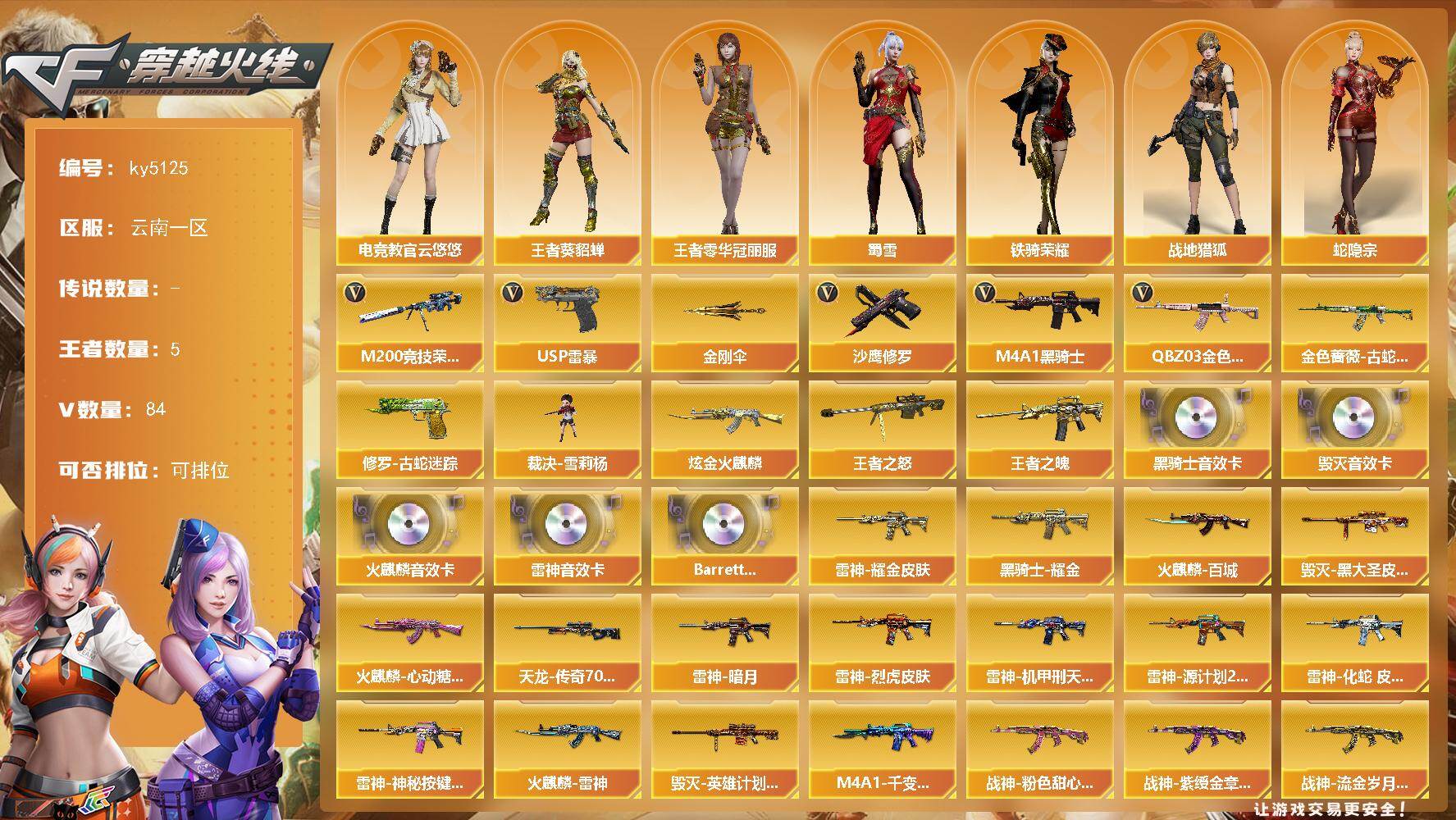 [16354858]云南一区-84V-5王者-1炫金 【热门武器】:QBZ03-金色蔷薇,金色蔷薇-古蛇迷踪,修罗-古蛇迷踪,M200-竞技荣光,M4A1-黑骑士,裁决-雪莉杨,USP-雷暴,沙鹰-修罗*2,金刚伞 【王者炫金武器】:王者之魄,王者之怒,炫金火麒麟 【音效卡】:AK47-火麒麟音效卡,M4A1-雷神音效卡,M4A1-黑骑士音效卡,Barrett-毁灭音效卡,Barrett-碧霄极光音效卡 【皮肤】:雷神-暗月,雷神-耀金皮肤,雷神-烈虎皮肤,雷神-机甲刑天皮肤,雷神-源计划2.0专属 皮肤,雷神-化蛇 皮肤,雷神-神秘按键 皮肤,火麒麟-雷神,火麒麟-百城,火麒麟-心动糖果,毁灭-黑大圣皮肤,毁灭-英雄计划 皮肤,M4A1-千变-孔明皮肤,黑骑士耀金皮肤,战神-粉色甜心皮肤*2,战神-紫绶金章皮肤*2,战神-流金岁月皮肤*3,AWM-天龙-传奇70KG 【角色】:电竞教官-云悠悠,战地猎狐,王者零-华冠丽服,王者-葵-貂蝉,蛇隐宗,奇洋探员,乔伊教练,修道士,云海玲珑,飞虎队-X,虎妞,嘉年华灵狐,灵狐者-X,灵狐者-黄金海岸,灵狐者-七夕宝贝,潘多拉-X,潘多拉-甜心教官,潜龙队-X,蛇姬,斯沃特-X,蜀雪,铁骑荣耀,樱-战斗天使,影武者-X,游珑儿 【人偶武器】:裁决-雪莉杨,AWM-灵狐-15周年嘉年华,迷你深渊冰龙,迷你牛魔王,生化手雷-机甲核心*2,闪光弹-小乔 【暴走生化】:超级对讲机 【挑战大师】:AK47-冰龙粉碎者,冰龙粉碎者-白马银枪*2,VEPR-12-金魔,激光毁灭者III,神圣爆裂者-末日III 【英雄级武器】:AK47-火麒麟,M4A1-雷神,M4A1-黑骑士,AK47-黑鲨,无影-神兵利器,黑武士-锦绣游龙,金色蔷薇-古蛇迷踪,QBZ03-金色蔷薇,王者之魄-觉醒版*2,AK-47-猩红传说*31,AK47-B-战神,Barrett-毁灭,M200-竞技荣光,王者之力-觉醒版,沙鹰-修罗*2,USP-雷暴,柯尔特-竞技荣光*2,天神-动感闪耀,修罗-古蛇迷踪,屠龙,马来剑-夜魔,麒麟刺,擎天-竞技荣光,高爆手雷-夜魔*3,高爆手雷-竞技荣光*7,手雷-动感闪耀,高爆手雷-古蛇迷踪,闪光弹-夜魔*3,闪光弹-竞技荣光*5,烟雾弹-夜魔*3,烟雾弹-竞技荣光*5,烟雾弹-古蛇迷踪,M4A1-赤狱骑士,M4A1-苍鸣雷神,AWM-昌龙,Barr