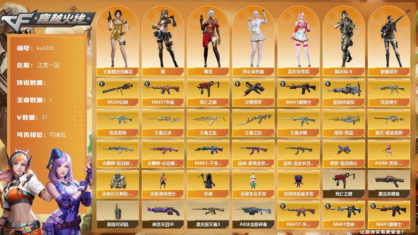 [16358028]江苏一区-27V-7王者-3炫金 【热门武器】:HK417-朱雀,M200-幻神,死亡之眼,M4A1-黑骑士,加特林-炼狱*2,沙鹰-修罗 【王者炫金武器】:王者冰魄,王者之鲨,王者之影,王者之决,炼狱-悦蓝,炫金骑士,炫金雷神*2 【皮肤】:火麒麟-轻羽皮肤,火麒麟-心动糖果,毁灭耀金皮肤,M4A1-千变-孔明皮肤,战神-紫绶金章皮肤,战神-流金岁月皮肤,修罗-能量核心 【角色】:葵,王者-瞳-闭月羞花,芳心审判者,嘉年华灵狐,斯沃特-X,蜀雪,新娜塔莎 【人偶武器】:AWM-灵狐-15周年嘉年华,迷你波特博士,夺魂,迷你生化手雷,深渊终结者手雷,迷你巨石泰坦-魔花研究所 【暴走生化】:黑龙吞噬者,死亡之眼,超级对讲机 【挑战大师】:AK47-冰龙粉碎者,激光毁灭者III,神圣爆裂者-末日III*2 【英雄级武器】:AK47-火麒麟*3,M4A1-雷神,M4A1-黑骑士,HK417-朱雀,无影-神兵利器,王者之武-觉醒版,AK-47-猩红传说*3,黑武士-CF网剧冠军,Barrett-毁灭,M200-幻神,加特林-炼狱*2,烈龙-悦心-觉醒版,AA-12-雷霆,沙鹰-修罗,天神-CF网剧冠军,屠龙,马来剑-夜魔,麒麟刺,擎天-CF网剧冠军,高爆手雷-夜魔,闪光弹-夜魔,烟雾弹-夜魔 【道具】:战舰背包,炫彩背包,超级背包,黄金生化钩,变异宝贝,夺命之镰,防化服,防弹头盔*4,防弹衣*5,C4工具钳*3,手雷包*3 【特殊枪械】:1黑骑士,2炼狱