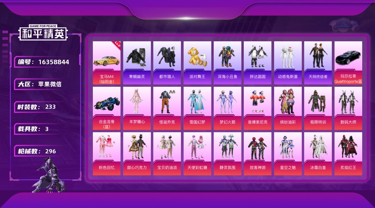 苹果 微信-无敌战神框-38粉装-14特效枪-3载具-5粉色飞行器-115393热力值-16王牌印记-233套装-296枪皮