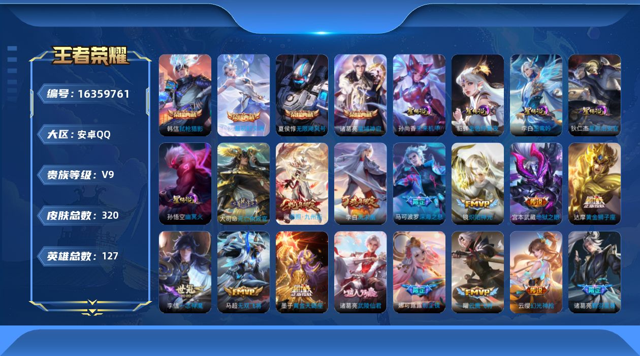 [16359761]【特价出售/店主推荐,发育路27段,,1市标,2988星币】安卓Q-V9-最强王者段位-127英雄-320皮肤-4典藏皮肤-5星传说-33传说-85史诗
