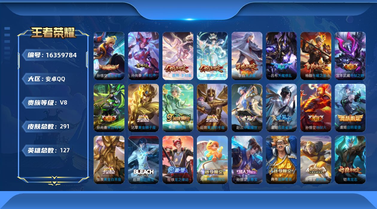 [16359784]【特价出售/店主推荐】安卓Q-V8-永恒钻石II段位-127英雄-291皮肤-1典藏皮肤-16传说-69史诗