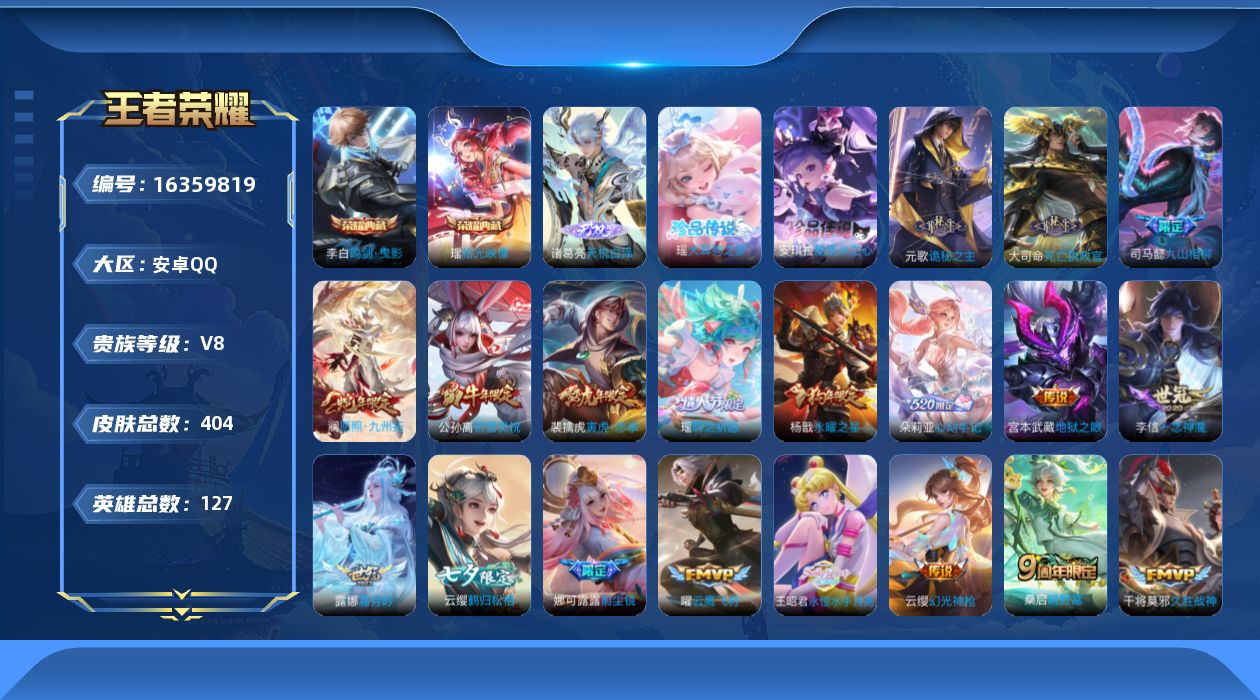 [16359819]【特价出售/店主推荐 游走26段 打野22段】安卓Q-V8-最强王者段位-127英雄-404皮肤-2典藏皮肤-1无双-2珍品传说-32传说-118史诗