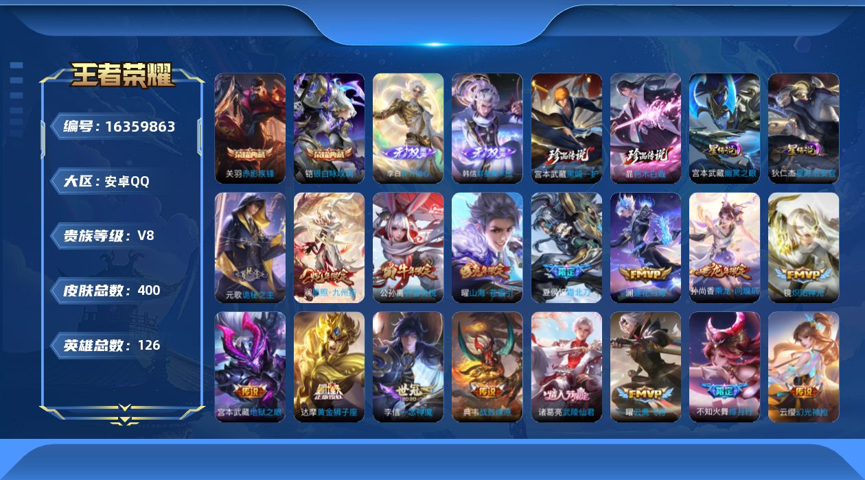 [16359863]【店主推荐捡漏号!可直接换绑】安卓Q-V9-最强王者段位-126英雄-400皮肤-2典藏皮肤-2无双-2珍品传说-31传说-130史诗-2星元 【英雄全皮】:元歌全皮,宫本武藏全皮,孙权全皮,鬼谷子全皮,云中君全皮,鲁班大师全皮,蒙恬全皮,影全皮,海诺全皮 【荣耀典藏】:关羽赤影疾锋,铠银白咏叹调 【无双皮肤】:李白碎月剑心,韩信群星魔术团 【珍品传说】:暃朽木白哉,宫本武藏黑崎一护 【传说皮肤】:后羿神树通天,元歌诡秘之主,澜愿照九州拓,云缨幻光神枪,王昭君映山客,桑启鸣野蒿,夏侯惇霜北刀,云中君群星魔术团,典韦战鼓燎原,孙尚香乘龙问璇玑,澜逐花归海,宫本武藏惊梅引,马可波罗妄想实况,孙悟空齐天大圣,曜山海苍雷引,李白诗剑行,不知火舞绯月行,百里守约碎云,赵云淬星耀世,公孙离祈雪灵祝,镜炽阳神光,虞姬启明星使,曜云鹰飞将,李信一念神魔,干将莫邪久胜战神,虞姬云霓雀翎,达摩黄金狮子座,后羿黄金射手座,诸葛亮武陵仙君,宫本武藏地狱之眼,狄仁杰超时空战士 【限定皮肤】:夏侯惇霜北刀,蒙犽顽岩魄,蔡文姬夏日便利店,大乔绒语心约,虞姬夏日便利店,姜子牙天穹之誓,杨戬破阵退雄兵,李白谪仙醉月,狄仁杰阴阳师,赵云皇家上将,墨子神迹守卫,鲁班七号乒乒小将,庄周高山流水,高渐离玩趣恶龙,阿轲迷踪丽影,钟无艳超时空战士,扁鹊奇幻香踪,白起夜都怪侠,芈月幻夜卜梦,元歌云间偶戏,元歌无心,甄姬落雪兰心,马可波罗逐梦之星,马可波罗山海玄木吟,马可波罗妄想实况,狄仁杰魔术师,狄仁杰万华元夜,达摩沙漠行僧,项羽海滩派对,老夫子醍醐杖,老夫子航海奇遇记,关羽冰锋战神,安琪拉魔法小厨娘,程咬金演武夺筹,韩信逐梦之影,韩信飞衡,韩信傲雪梅枪,王昭君午后时光,兰陵王金庭之子,花木兰默契交锋,不知火舞绯月行,亚瑟潮玩骑士王,孙悟空至尊宝,孙悟空孙行者,孙悟空齐天大圣,后羿圣弓游侠,李元芳云中旅人,虞姬启明星使,钟馗驱傩正仪,杨玉环寅虎心曲,杨戬潮玩骑兵,干将莫邪冰霜恋舞曲,干将莫邪真爱魔法,雅典娜黎明之约,蔡文姬繁星吟游,鬼谷子原初探秘者,鬼谷子五谷丰年,诸葛亮武陵仙君,黄忠火炮绅士,苏烈千军破阵,百里玄策原初追逐者,弈星混沌棋,梦奇顽趣,公孙离祈雪灵祝,公孙离玉兔公主,沈梦溪大漠名商,明世隐疑决卦,明世隐吟游魔法,裴擒虎李小龙,裴擒虎擒涛扼浪,狂铁电玩高手,云中君纤云弄巧,云中君时之祈愿,伽罗天狼溯