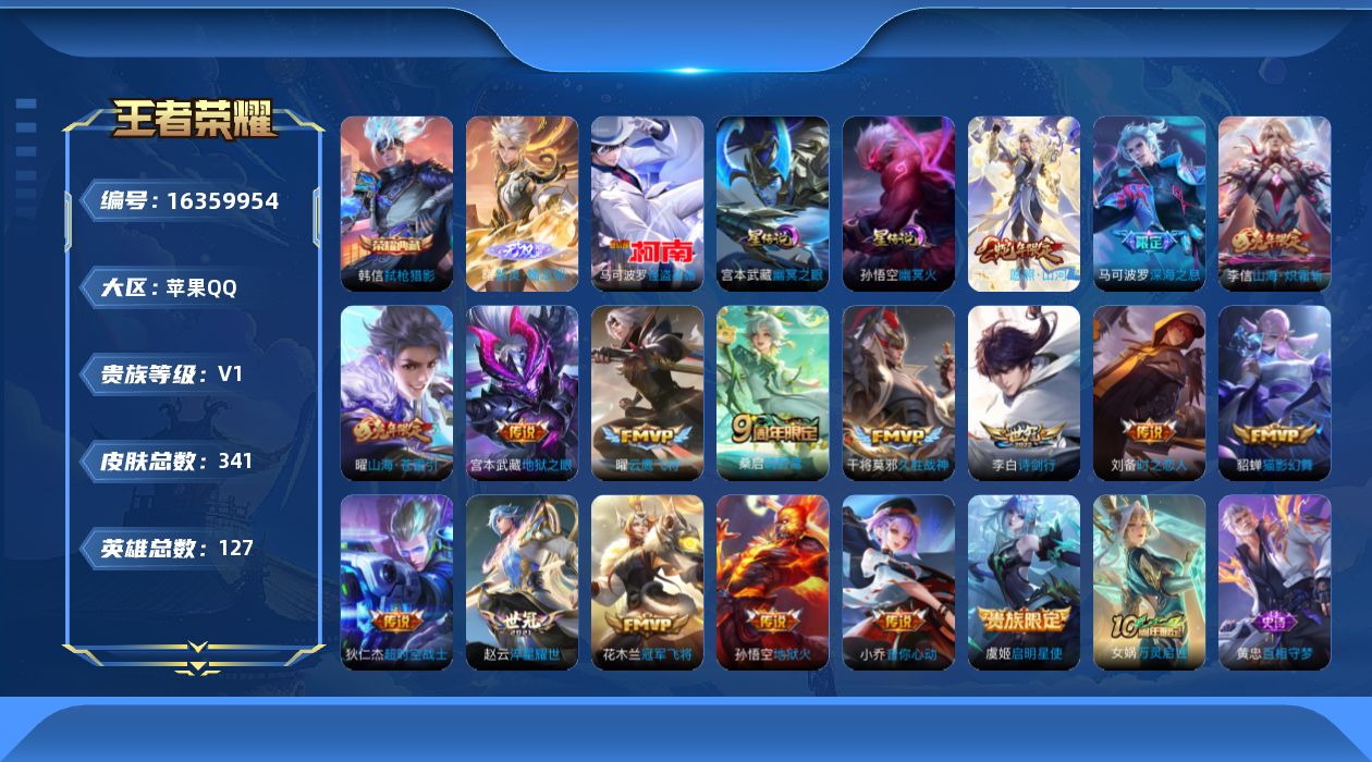 [16359954]【店主推荐捡漏号!可直接换绑】苹果Q-V8-最强王者段位-127英雄-341皮肤-1典藏皮肤-1无双-1珍品传说-18传说-102史诗-2星元