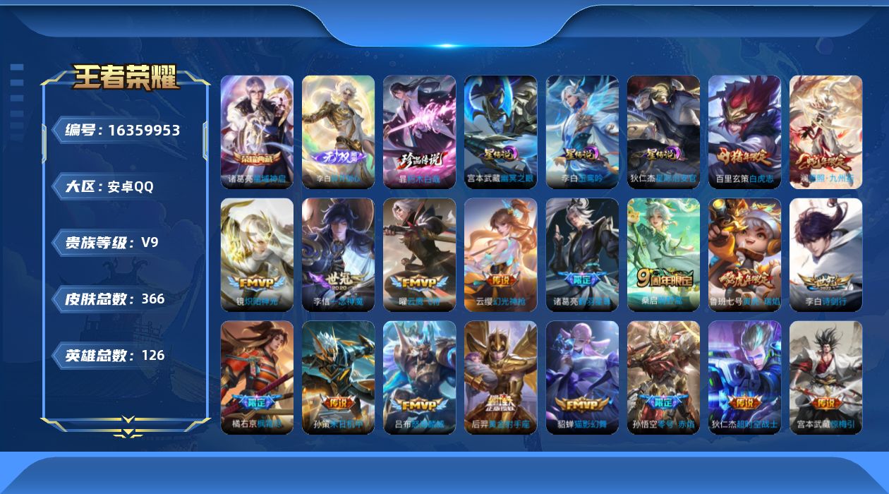 [16359953]【店主推荐捡漏号!可直接换绑】安卓Q-V9-最强王者段位37段打野1W百里玄策-126英雄-366皮肤-1典藏皮肤-1无双-1珍品传说-21传说-102史诗-4星元 【英雄全皮】:孙权全皮,橘右京全皮,鬼谷子全皮,狂铁全皮,戈娅全皮,影全皮 【荣耀典藏】:诸葛亮星域神启 【无双皮肤】:李白碎月剑心 【珍品传说】:暃朽木白哉 【传说皮肤】:后羿神树通天,澜愿照九州拓,云缨幻光神枪,桑启鸣野蒿,宫本武藏惊梅引,诸葛亮鹤羽星尊,吕布怒海麟威,李白诗剑行,橘右京枫霜尽,孙策末日机甲,鲁班七号寅虎瑞焰,镜炽阳神光,虞姬启明星使,孙悟空零号赤焰,曜云鹰飞将,李信一念神魔,貂蝉猫影幻舞,百里玄策白虎志,后羿黄金射手座,孙悟空地狱火,狄仁杰超时空战士 【限定皮肤】:白起狰,姜子牙天穹之誓,狄仁杰阴阳师,赵云皇家上将,墨子神迹守卫,妲己热情桑巴,鲁班七号寅虎瑞焰,庄周高山流水,高渐离玩趣恶龙,阿轲迷踪丽影,钟无艳王者之锤,钟无艳超时空战士,扁鹊奇幻香踪,白起夜都怪侠,芈月重明,芈月幻夜卜梦,元歌云间偶戏,元歌无心,甄姬游园惊梦,甄姬落雪兰心,曹操烛龙,典韦穷奇,典韦岱宗,马可波罗逐梦之星,马可波罗山海玄木吟,狄仁杰魔术师,狄仁杰万华元夜,达摩星际陆战队,达摩沙漠行僧,项羽海滩派对,老夫子醍醐杖,老夫子航海奇遇记,程咬金演武夺筹,韩信傲雪梅枪,王昭君午后时光,兰陵王金庭之子,橘右京枫霜尽,亚瑟潮玩骑士王,孙悟空至尊宝,孙悟空零号赤焰,孙悟空孙行者,后羿如梦令,后羿圣弓游侠,李元芳银河之约,李元芳云中旅人,虞姬启明星使,钟馗驱傩正仪,杨玉环遇见飞天,杨戬潮玩骑兵,干将莫邪冰霜恋舞曲,干将莫邪真爱魔法,雅典娜单词大作战,雅典娜黎明之约,太乙真人饕餮,鬼谷子原初探秘者,鬼谷子五谷丰年,诸葛亮鹤羽星尊,黄忠火炮绅士,苏烈千军破阵,百里玄策白虎志,百里玄策原初追逐者,百里守约朱雀志,弈星混沌棋,沈梦溪大漠名商,明世隐疑决卦,明世隐吟游魔法,裴擒虎李小龙,裴擒虎擒涛扼浪,狂铁御狮,狂铁电玩高手,米莱狄胡桃异想国,云中君纤云弄巧,猪八戒猪悟能,嫦娥拒霜思,嫦娥暖冬兔眠,西施玲珑珍味,蒙犽狂想玩偶喵,鲁班大师探海日志,桑启海盐诗旅,暃星界游侠,戈娅驭风魔法,艾琳女武神,艾琳流音漫舞,司空震地狱燃心,阿古朵江河有灵,张良古海寻踪,蒙犽百解令,鬼谷子天穹祈灯,李白碎月剑心,沈梦溪龙舞盛年,镜青焰无极 【