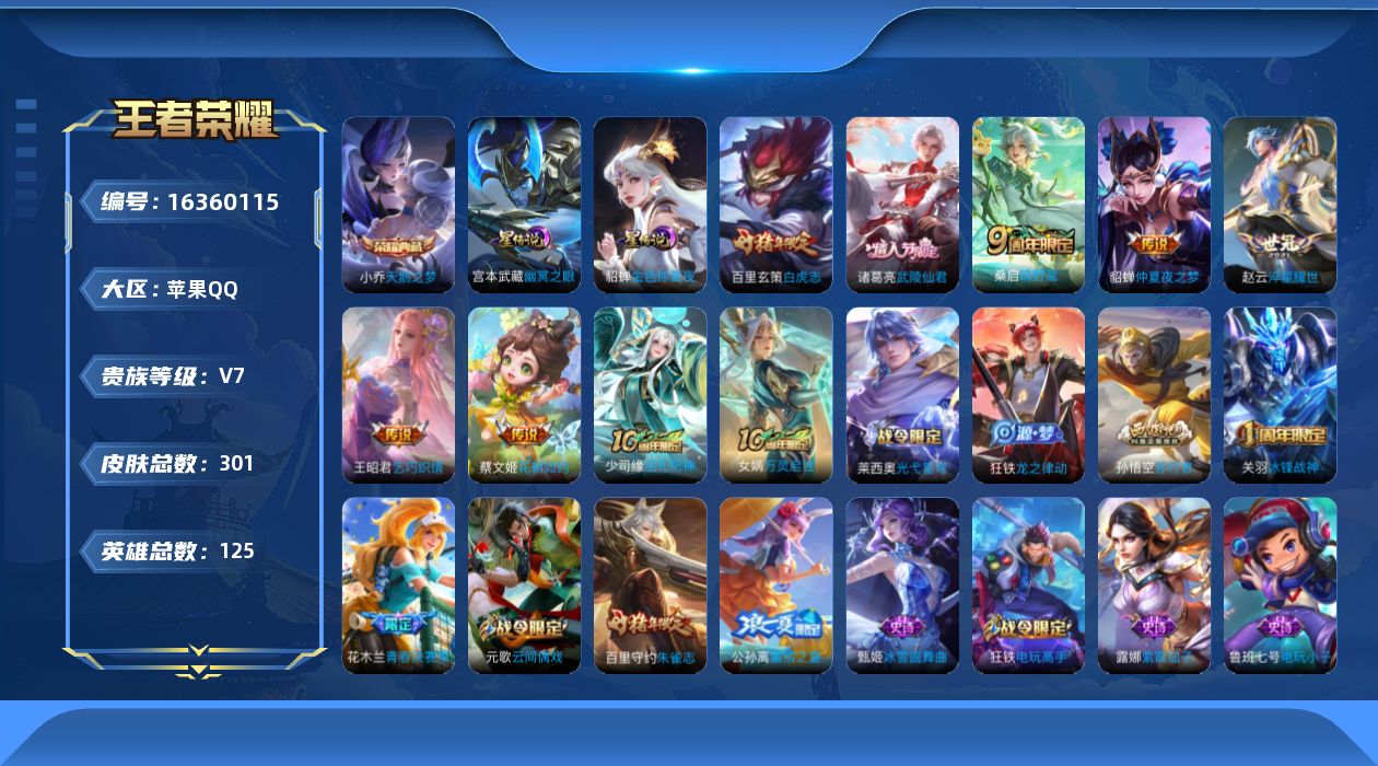 [16360115]【特价急出/详情看图】苹果Q-V7-最强王者段位-125英雄-301皮肤-1典藏皮肤-2星元-8传说-79史诗
