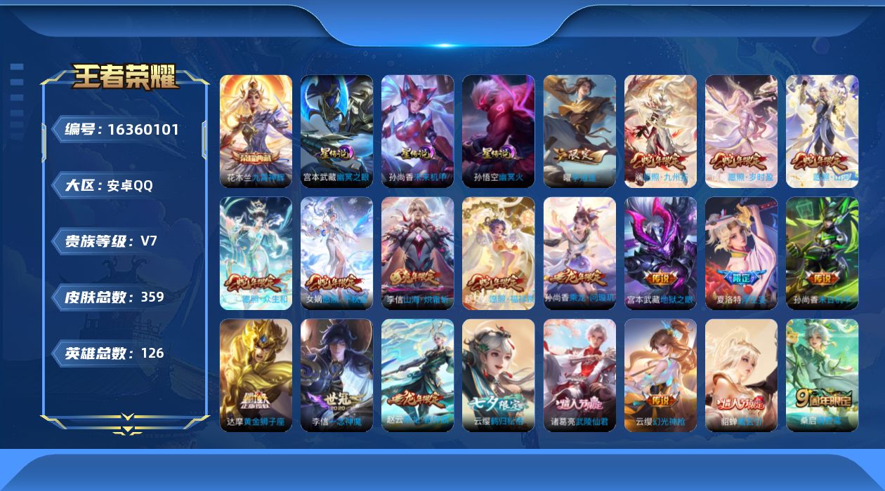 [16360101]【特价急出/详情看图】安卓Q-V7-最强王者段位-126英雄-359皮肤-1典藏皮肤-3星元-32传说-116史诗