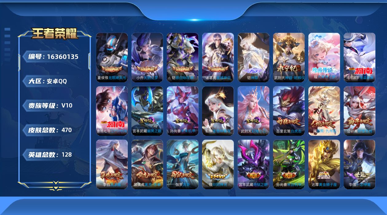[16360135]可二次【特价出售/店主推荐,打野45段,中路45段】,安卓Q-V10-最强王者段位-128英雄-470皮肤-4典藏皮肤-1典藏英雄-2无双-3珍品传说-41传说-150史诗 【英雄全皮】:刘禅全皮,达摩全皮,刘邦全皮,孙权全皮,钟馗全皮,太乙真人全皮,鬼谷子全皮,沈梦溪全皮,猪八戒全皮,阿古朵全皮,空空儿全皮,影全皮 【荣耀典藏】:武则天英雄,夏侯惇无限飓风号,小乔天鹅之梦,诸葛亮星域神启,铠银白咏叹调 【无双皮肤】:武则天神器明辉仪,铠神罪 【珍品传说】:马可波罗怪盗基德,鲁班七号江户川柯南,瑶大耳狗之梦 【传说皮肤】:后羿神树通天,澜愿照九州拓,云缨幻光神枪,王昭君映山客,桑启鸣野蒿,典韦战鼓燎原,艾琳觅芳踪,大乔时之奇旅,诸葛亮鹤羽星尊,干将莫邪画中仙,马超无双飞将,裴擒虎寅虎赤拳,鲁班七号寅虎瑞焰,孙尚香异界灵契,赵云淬星耀世,西施游龙清影,公孙离祈雪灵祝,诸葛亮时雨天司,镜炽阳神光,虞姬启明星使,关羽武圣,曜云鹰飞将,李信一念神魔,刘备时之恋人,伽罗太华,貂蝉猫影幻舞,张良黄金白羊座,虞姬云霓雀翎,达摩黄金狮子座,百里玄策白虎志,花木兰冠军飞将,梦奇胖达荣荣,后羿黄金射手座,诸葛亮武陵仙君,貂蝉仲夏夜之梦,李白凤求凰,孙尚香末日机甲,宫本武藏地狱之眼,孙悟空地狱火,武则天海洋之心,狄仁杰超时空战士 【限定皮肤】:白起狰,蔡文姬夏日便利店,虞姬夏日便利店,姜子牙天穹之誓,狄仁杰阴阳师,小乔纯白花嫁,虞姬凯尔特女王,廉颇寅虎御盾,赵云皇家上将,赵云龙胆,墨子神迹守卫,妲己时之彼端,嬴政优雅恋人,嬴政白昼王子,孙尚香蔷薇恋人,孙尚香异界灵契,鲁班七号狮舞东方,鲁班七号寅虎瑞焰,庄周蜃楼王,庄周高山流水,高渐离死亡摇滚,高渐离玩趣恶龙,阿轲迷踪丽影,孙膑妖精王,孙膑寅虎展翼,扁鹊炼金王,芈月重明,芈月白晶晶,芈月幻夜卜梦,吕布猎兽之王,吕布御风骁将,周瑜真爱至上,周瑜赤莲之焰,元歌云间偶戏,元歌无心,夏侯惇朔风刀,甄姬女儿国国王,甄姬游园惊梦,甄姬落雪兰心,曹操烛龙,曹操天狼征服者,典韦穷奇,马可波罗逐梦之星,马可波罗暗影游猎,狄仁杰魔术师,狄仁杰万华元夜,达摩星际陆战队,达摩沙漠行僧,项羽海滩派对,老夫子圣诞老人,老夫子醍醐杖,老夫子航海奇遇记,关羽冰锋战神,关羽武圣,安琪拉魔法小厨娘,程咬金演武夺筹,刘邦夺宝奇兵,韩信傲雪梅枪,王昭君凤凰于飞,兰陵王驯魔猎人
