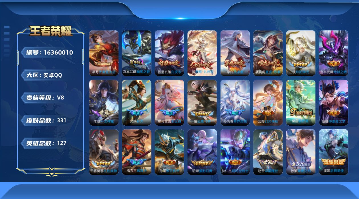 [16360010]【特价出售/店主推荐】:安卓Q-V8-最强王者段位-127英雄-331皮肤-1典藏皮肤-1星元-22传说-95史诗
