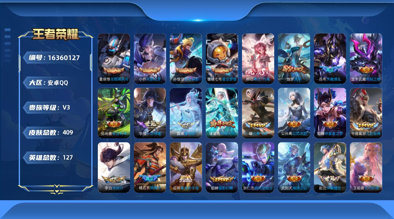 [16360127]【特价出售/店主推荐】安卓Q-V3-最强王者段位-127英雄-409皮肤-4典藏皮肤-1典藏英雄-1无双-24传说-130史诗