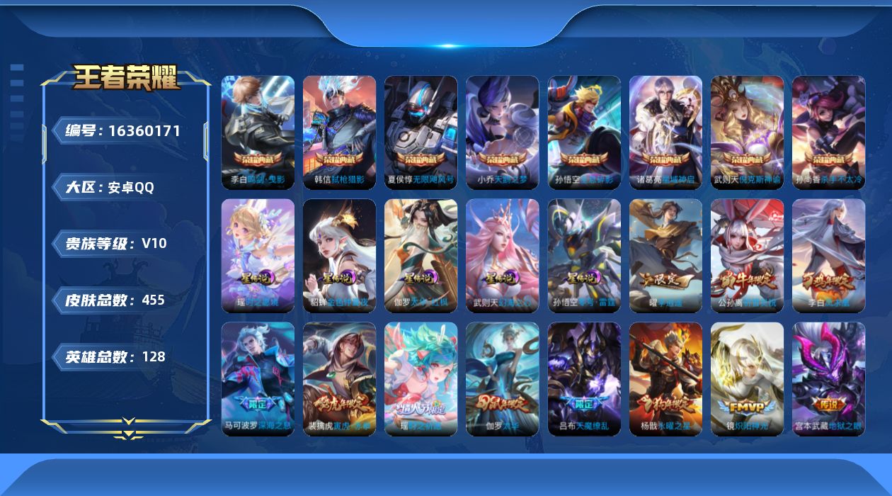 [16360171]【特价出售/店主推荐】安卓Q-V10-最强王者段位-128英雄-454皮肤-8典藏皮肤-1典藏英雄-6星传说-51传说-153史诗