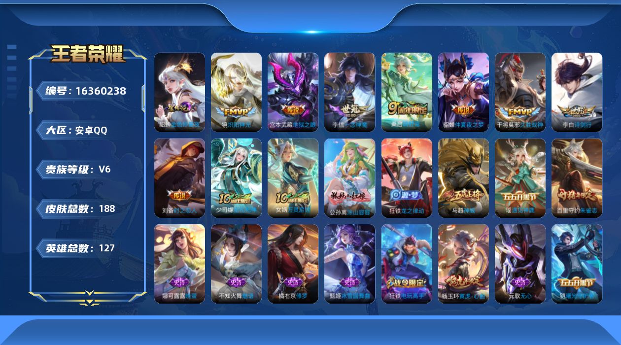[16360238]可二次【店主推荐捡漏号!可直接换绑】安卓Q-V6-至尊星耀II段位-127英雄-188皮肤-9传说-2星传说-51史诗