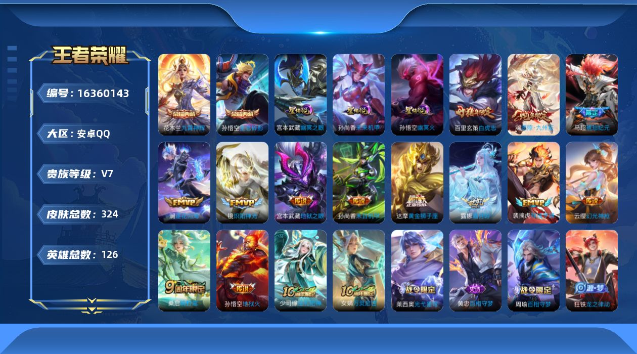 [16360143]【店主推荐捡漏号!可直接换绑】安卓Q-V7-最强王者段位36段打野金标孙悟空-126英雄-324皮肤-2典藏皮肤-13传说-83史诗-3星元