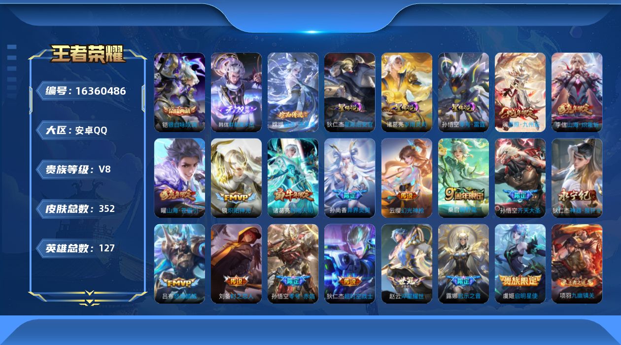 - [16329882]安卓WX-V7-至尊星耀V段位-128英雄-246皮肤-1典藏皮肤-8传说-81史诗-中路54段-1星传说 【荣耀典藏】:虞姬神鉴启示录 【传说皮肤】:女娲愿照千秋盛,桑启鸣野蒿,貂蝉曦玄引,孙尚香乘龙问璇玑,西施游龙清影,李信一念神魔,梦奇胖达荣荣,貂蝉仲夏夜之梦 【限定皮肤】:蒙犽顽岩魄,蔡文姬夏日便利店,大乔绒语心约,虞姬夏日便利店,姜子牙天穹之誓,狄仁杰阴阳师,赵云皇家上将,嬴政优雅恋人,钟无艳超时空战士,扁鹊奇幻香踪,白起夜都怪侠,芈月幻夜卜梦,甄姬落雪兰心,马可波罗山海玄木吟,狄仁杰魔术师,达摩沙漠行僧,项羽海滩派对,貂蝉逐梦之音,兰陵王金庭之子,李元芳云中旅人,杨玉环遇见飞天,杨玉环寅虎心曲,杨戬潮玩骑兵,干将莫邪胡桃夹子,雅典娜黎明之约,鬼谷子五谷丰年,黄忠火炮绅士,百里玄策原初追逐者,百里守约朱雀志,梦奇顽趣,公孙离玉兔公主,沈梦溪大漠名商,沈梦溪匿光破解者,明世隐吟游魔法,裴擒虎擒涛扼浪,瑶山海碧波行,云中君纤云弄巧,上官婉儿天狼绘梦者,嫦娥拒霜思,嫦娥暖冬兔眠,西施玲珑珍味,鲁班大师探海日志,桑启海盐诗旅,暃星界游侠,戈娅驭风魔法,艾琳女武神,阿古朵江河有灵,张良古海寻踪,蒙犽百解令,蒙恬荣光圣徽,高渐离燃音魔法,妲己灵卜魔法,鬼谷子天穹祈灯,孙尚香乘龙问璇玑,貂蝉曦玄引,沈梦溪龙舞盛年,鲁班七号蔬乡物语,李元芳蔬乡物语,刘邦剑破天穹,程咬金群星魔术团,周瑜熔金海岸 【年限皮肤】:百里守约朱雀志,杨玉环寅虎心曲,瑶山海碧波行,马可波罗山海玄木吟,孙尚香乘龙问璇玑 【赛季限定】:达摩沙漠行僧,兰陵王金庭之子,张良古海寻踪,李元芳云中旅人,雅典娜黎明之约,百里玄策原初追逐者,梦奇顽趣,沈梦溪大漠名商,裴擒虎擒涛扼浪,鲁班大师探海日志,桑启海盐诗旅,鬼谷子天穹祈灯,蒙恬荣光圣徽,刘邦剑破天穹,姜子牙天穹之誓 【战令限定】:蔡文姬夏日便利店,虞姬夏日便利店,钟无艳超时空战士,扁鹊奇幻香踪,白起夜都怪侠,芈月幻夜卜梦,甄姬落雪兰心,杨戬潮玩骑兵,黄忠火炮绅士,明世隐吟游魔法,嫦娥暖冬兔眠,西施玲珑珍味,暃星界游侠,戈娅驭风魔法,高渐离燃音魔法,妲己灵卜魔法,鲁班七号蔬乡物语,李元芳蔬乡物语 【史诗皮肤】:露娜紫霞仙子,赵云皇家上将,赵云未来纪元,貂蝉圣诞恋歌,甄姬冰雪圆舞曲,王昭君偶像歌手,狄仁杰魔术师,廉颇地狱岩魂,宫本武藏鬼剑武藏,孙尚香水果甜心,