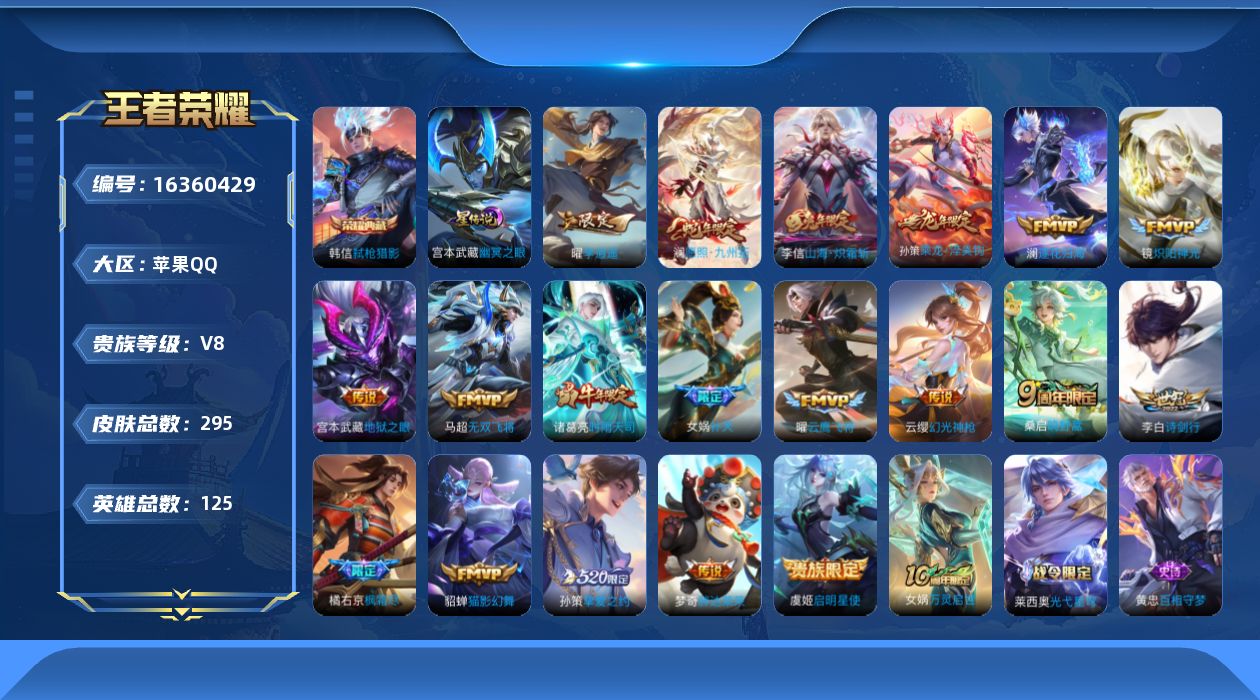 [16360429]【特价急出/详情看图】苹果Q-V8-最强王者段位-125英雄-295皮肤-1典藏皮肤-1星元-20传说-84史诗