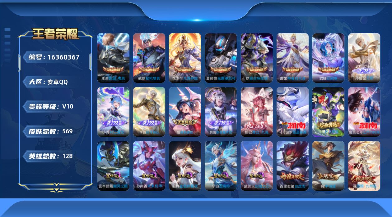[16360367]【特价出售/店主推荐】安卓Q-V10-最强王者段位-128英雄-569皮肤-7典藏皮肤-1典藏英雄-6无双-3珍品传说-89传说-5星传说-177史诗