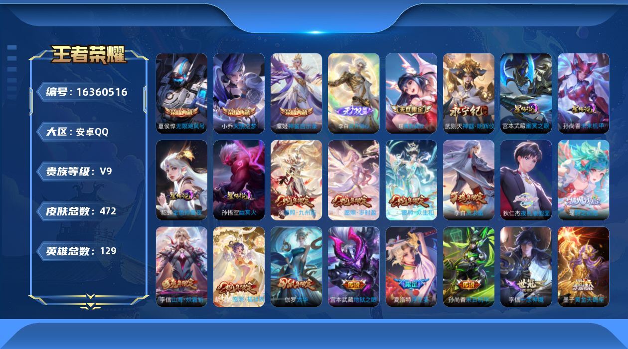 - [14835391]【店主推荐捡漏号!可直接换绑】安卓Q-V7-最强王者段位-123英雄-194皮肤-1珍品传说-4传说-44史诗-1星元 【英雄全皮】:空空儿全皮 【珍品传说】:暃朽木白哉 【传说皮肤】:司马懿九山相柳,桑启鸣野蒿,赵云乘龙铭钟鼎,貂蝉仲夏夜之梦 【限定皮肤】:姜子牙天穹之誓,狄仁杰阴阳师,廉颇寅虎御盾,赵云皇家上将,高渐离玩趣恶龙,钟无艳王者之锤,周瑜赤莲之焰,元歌无心,夏侯惇朔风刀,马可波罗逐梦之星,狄仁杰魔术师,狄仁杰万华元夜,达摩沙漠行僧,项羽海滩派对,老夫子醍醐杖,程咬金演武夺筹,兰陵王驯魔猎人,兰陵王金庭之子,孙悟空孙行者,牛魔御旌,后羿圣弓游侠,李元芳云中旅人,钟馗驱傩正仪,干将莫邪真爱魔法,雅典娜黎明之约,鬼谷子原初探秘者,苏烈千军破阵,百里玄策原初追逐者,弈星混沌棋,梦奇顽趣,沈梦溪大漠名商,明世隐疑决卦,裴擒虎李小龙,裴擒虎擒涛扼浪,米莱狄御霄,云中君纤云弄巧,伽罗天狼溯光者,盾山御銮,鲁班大师探海日志,桑启海盐诗旅,艾琳女武神,张良古海寻踪,鬼谷子天穹祈灯,赵云乘龙铭钟鼎,刘邦剑破天穹,程咬金群星魔术团,镜青焰无极,刘备异域游侠,周瑜熔金海岸 【年限皮肤】:廉颇寅虎御盾,赵云乘龙铭钟鼎 【赛季限定】:夏侯惇朔风刀,狄仁杰万华元夜,达摩沙漠行僧,老夫子醍醐杖,程咬金演武夺筹,兰陵王金庭之子,张良古海寻踪,牛魔御旌,李元芳云中旅人,钟馗驱傩正仪,雅典娜黎明之约,鬼谷子原初探秘者,苏烈千军破阵,百里玄策原初追逐者,弈星混沌棋,梦奇顽趣,沈梦溪大漠名商,明世隐疑决卦,裴擒虎擒涛扼浪,米莱狄御霄,盾山御銮,鲁班大师探海日志,桑启海盐诗旅,鬼谷子天穹祈灯,刘邦剑破天穹,姜子牙天穹之誓 【战令限定】:周瑜赤莲之焰,兰陵王驯魔猎人,后羿圣弓游侠,干将莫邪真爱魔法,镜青焰无极 【史诗皮肤】:鲁班七号电玩小子,钟无艳王者之锤,赵云皇家上将,王昭君偶像歌手,狄仁杰魔术师,宫本武藏鬼剑武藏,孙尚香水果甜心,妲己魅力维加斯,妲己女仆咖啡,墨子龙骑士,墨子金属风暴,花木兰水晶猎龙者,刘邦德古拉伯爵,夏侯惇乘风破浪,诸葛亮黄金分割率,马可波罗逐梦之星,亚瑟心灵战警,铠曙光守护者,刘禅天才门将,程咬金功夫厨神,白起星夜王子,伽罗箭羽风息,狄仁杰鹰眼统帅,兰陵王驯魔猎人,娜可露露晚萤,橘右京修罗,百里玄策原初追逐者,裴擒虎李小龙,云中君纤云弄巧,伽罗天狼溯光者,干将莫邪真爱魔法