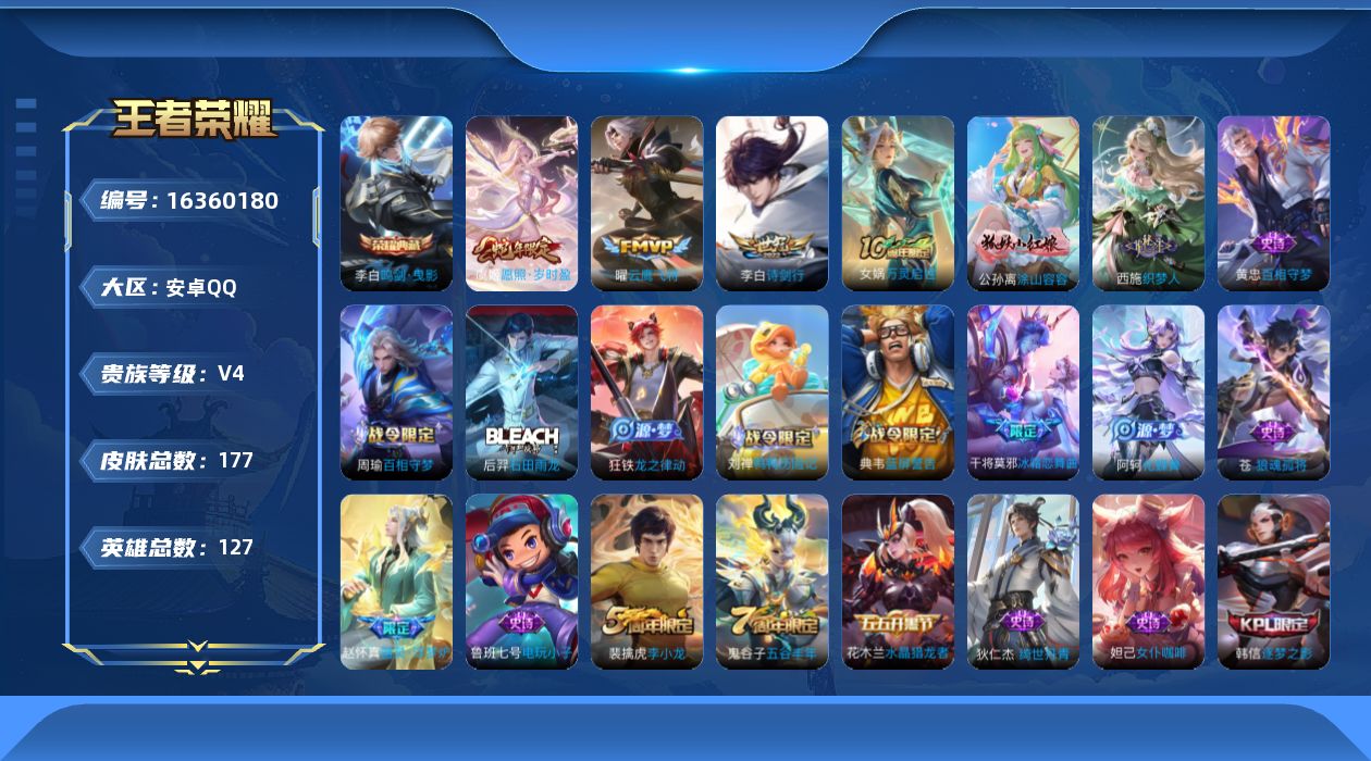 [16360180]可二次【特价急出/详情看图】安卓Q-V4-最强王者段位-127英雄-177皮肤-1典藏皮肤-4传说-41史诗