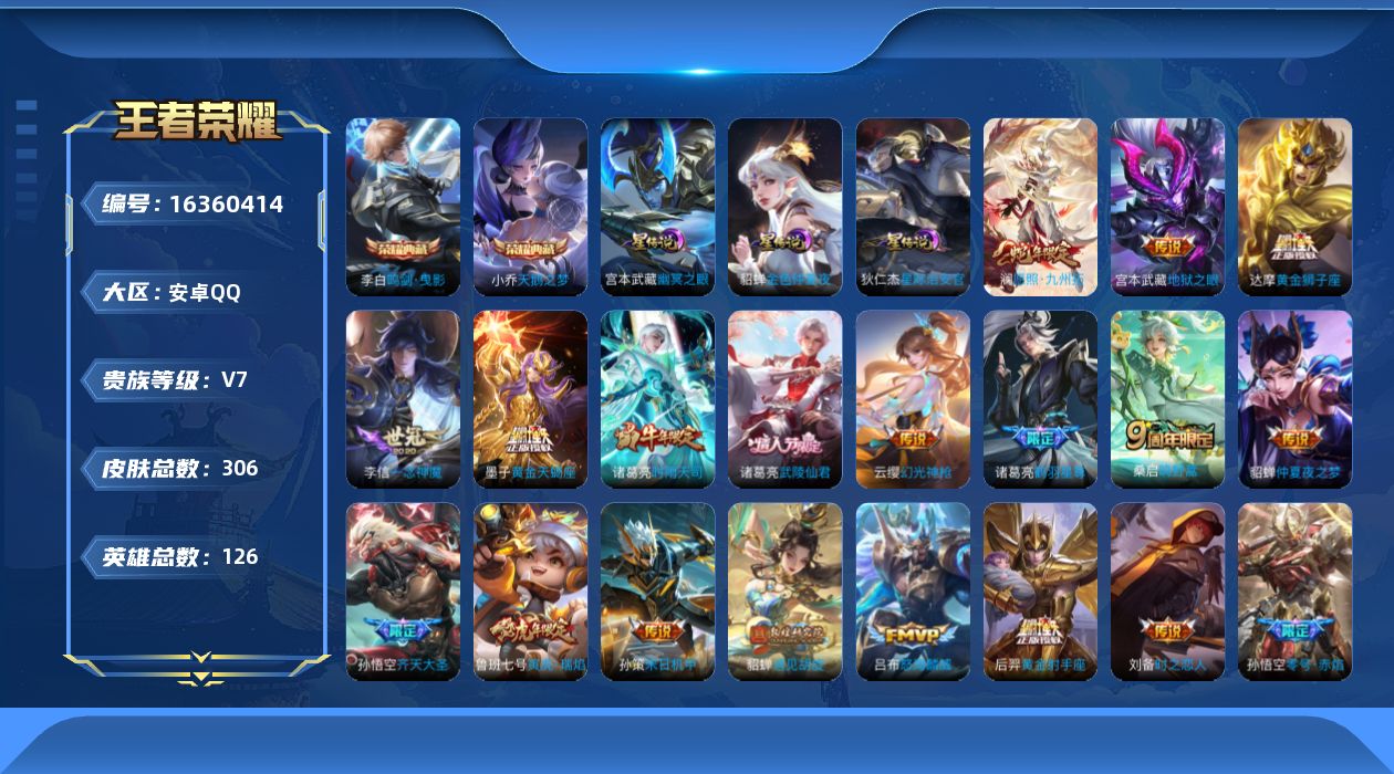 [16360414]可二次【特价出售/店主推荐】:安卓Q-V8-永恒钻石IV段位-126英雄-306皮肤-2典藏皮肤-3星元-30传说-91史诗