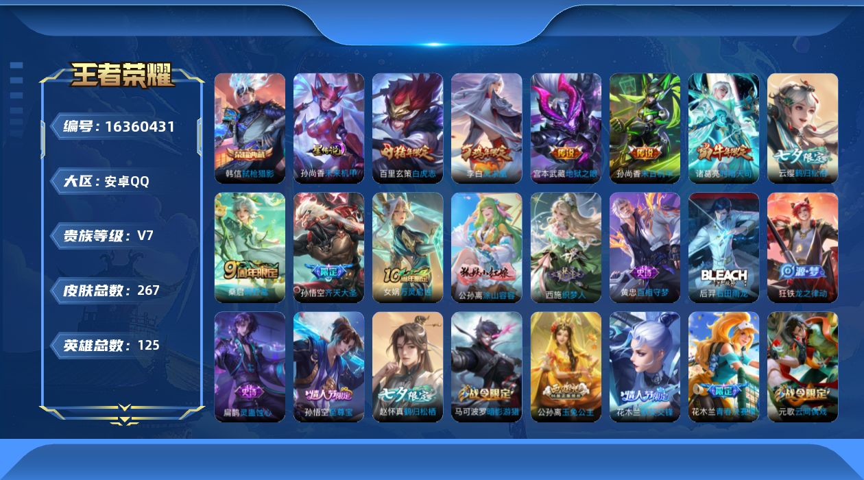 [16360431]【店主推荐捡漏号!可直接换绑】安卓Q-V7-至尊星耀IV段位-125英雄-267皮肤-1典藏皮肤-8传说-77史诗-1星元