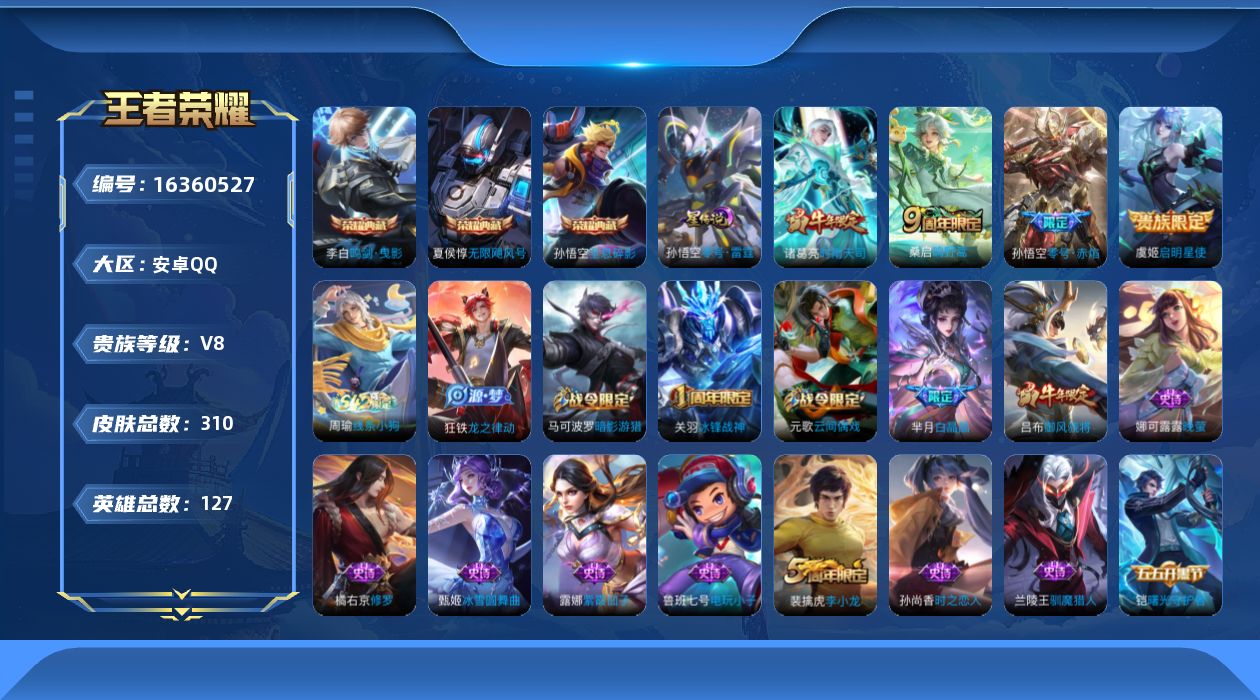 [16360527]【特价出售/店主推荐】安卓Q-V8-至尊星耀IV段位-127英雄-310皮肤-3典藏皮肤-1星传说-4传说-81史诗