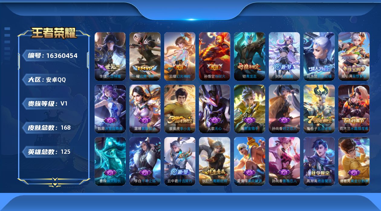 [16360454]可二次【特价出售/店主推荐】:安卓Q-V7-荣耀黄金II段位-125英雄-168皮肤-4传说-42史诗