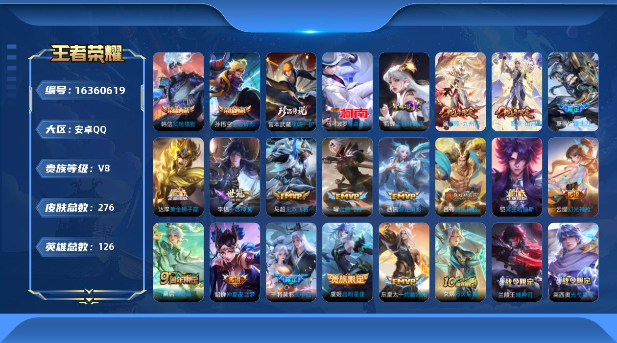 [16360619]【特价急出/详情看图】安卓Q-V8-最强王者段位-126英雄-276皮肤-2典藏皮肤-2珍品传说-1星元-16传说-75史诗
