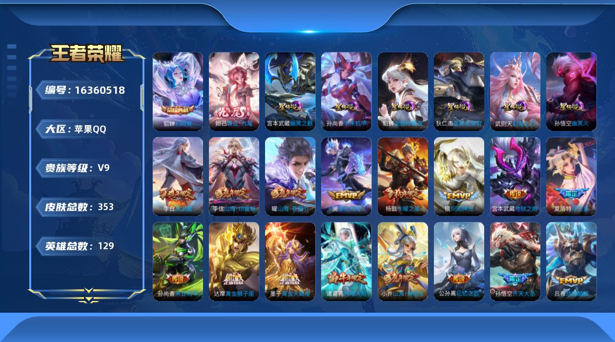 [16360518]可二次【特价出售/店主推荐】发育路30段,苹果Q-V9-至尊星耀III段位-129英雄-353皮肤-1典藏皮肤-1典藏英雄-1无双-7星传说-34传说-107史诗 【英雄全皮】:孙权全皮,金蝉全皮,戈娅全皮,空空儿全皮 【荣耀典藏】:武则天英雄,貂蝉幻阙歌 【无双皮肤】:妲己青丘九尾 【传说皮肤】:墨子黄金天蝎座,澜逐花归海,东皇太一灼幽烈阳,公孙离记忆之芯,夏洛特浮生妄,干将莫邪画中仙,花木兰燃星之曲,伽罗炽翼辉光,孙悟空齐天大圣,小乔山海琳琅生,曜山海苍雷引,李信山海炽霜斩,吕布怒海麟威,蔡文姬花朝如约,赵云淬星耀世,王昭君乞巧织情,周瑜音你心动,李元芳飞鸢探春,诸葛亮时雨天司,铠绛天战甲,镜炽阳神光,虞姬启明星使,刘备时之恋人,貂蝉猫影幻舞,张良黄金白羊座,达摩黄金狮子座,梦奇胖达荣荣,后羿黄金射手座,杨戬永曜之星,李白凤求凰,孙尚香末日机甲,宫本武藏地狱之眼,孙悟空地狱火,狄仁杰超时空战士 【限定皮肤】:蒙犽顽岩魄,姜子牙天穹之誓,狄仁杰阴阳师,小乔山海琳琅生,赵云皇家上将,赵云龙胆,嬴政优雅恋人,嬴政白昼王子,孙尚香蔷薇恋人,鲁班七号狮舞东方,庄周玄嵩,庄周高山流水,芈月白晶晶,吕布猎兽之王,夏侯惇朔风刀,甄姬幽恒,典韦穷奇,典韦蓝屏警告,马可波罗山海玄木吟,狄仁杰魔术师,项羽海滩派对,老夫子醍醐杖,关羽冰锋战神,程咬金演武夺筹,韩信飞衡,王昭君凤凰于飞,兰陵王金庭之子,花木兰燃星之曲,孙悟空至尊宝,孙悟空齐天大圣,牛魔御旌,牛魔奔雷神使,后羿辉光之辰,张飞虎魄,李元芳云中旅人,虞姬启明星使,钟馗神迹守卫,钟馗驱傩正仪,杨玉环遇见飞天,杨玉环寅虎心曲,杨戬永曜之星,女娲朔望之晖,干将莫邪画中仙,雅典娜黎明之约,鬼谷子原初探秘者,鬼谷子五谷丰年,诸葛亮时雨天司,黄忠烈魂,铠青龙志,苏烈玄武志,苏烈千军破阵,百里玄策原初追逐者,百里守约朱雀志,弈星混沌棋,梦奇顽趣,沈梦溪大漠名商,沈梦溪匿光破解者,明世隐疑决卦,裴擒虎李小龙,裴擒虎擒涛扼浪,狂铁御狮,米莱狄御霄,瑶山海碧波行,李信山海炽霜斩,伽罗炽翼辉光,盾山御銮,曜山海苍雷引,西施玲珑珍味,鲁班大师探海日志,盘古冰霜神祇,桑启海盐诗旅,夏洛特浮生妄,金蝉唐三藏,戈娅驭风魔法,艾琳女武神,艾琳流音漫舞,司空震地狱燃心,阿古朵江河有灵,张良古海寻踪,蒙恬荣光圣徽,高渐离燃音魔法,妲己灵卜魔法,鬼谷子天穹祈灯,