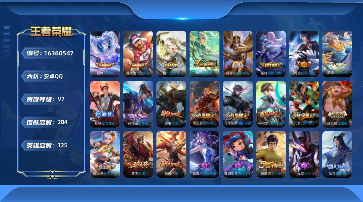 [16360547]【店主推荐捡漏号!可直接换绑】安卓Q-V7-至尊星耀II段位-125英雄-284皮肤-2典藏皮肤-6传说-68史诗
