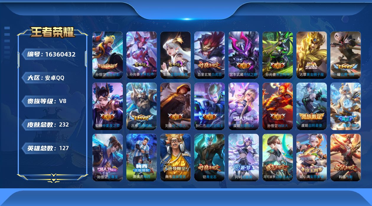 [16360432]【特价出售/店主推荐】安卓Q-V8-尊贵铂金I段位-127英雄-232皮肤-1典藏皮肤-2星传说-13传说-54史诗