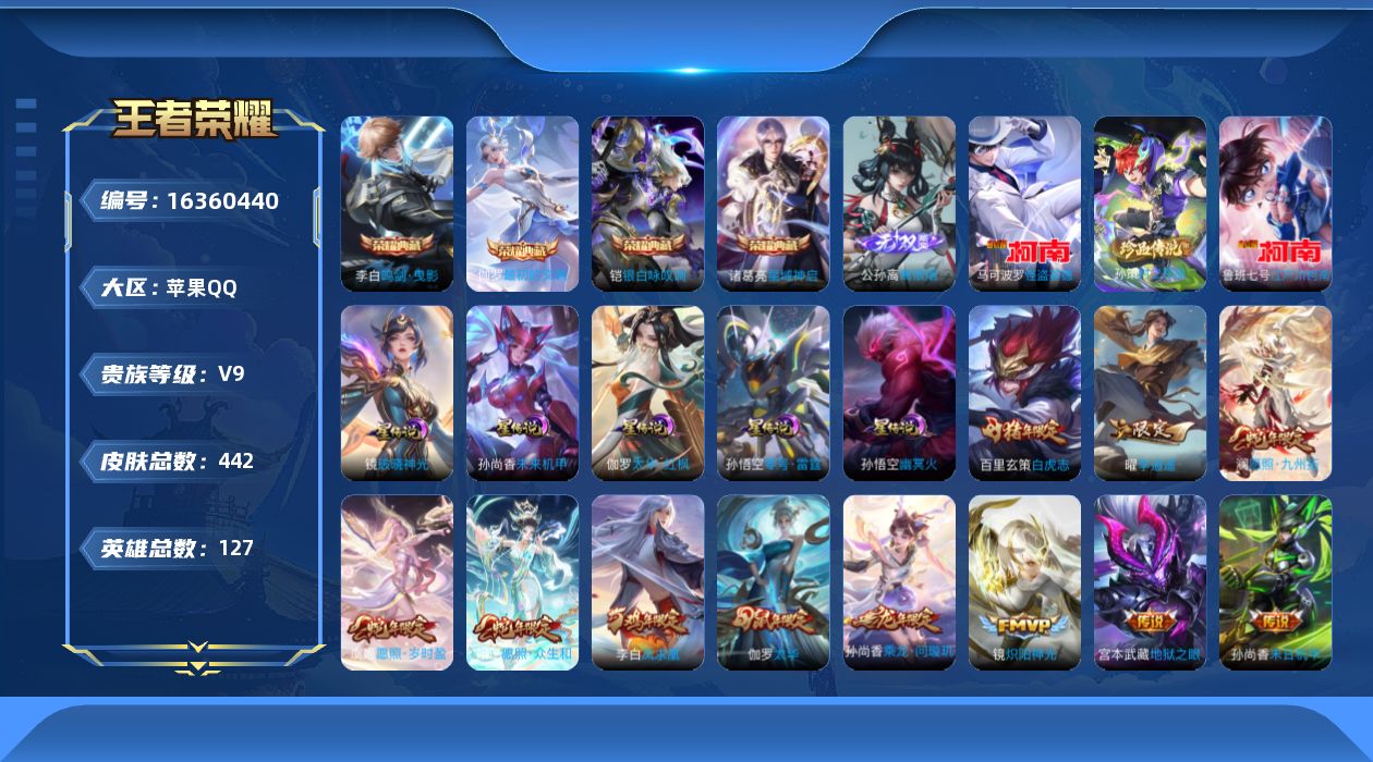 [16360440]【特价出售/店主推荐】苹果Q-V9-最强王者段位-127英雄-442皮肤-4典藏皮肤-1无双-3珍品传说-6星传说-36传说-148史诗