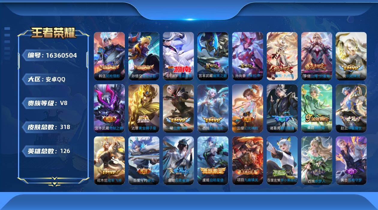 [16360504]可二次【特价出售/店主推荐/4市标/38段对抗/37段打野】:安卓Q-V8-至尊星耀II段位-126英雄-318皮肤-2典藏皮肤-1珍品传说-3星元-15传说-92史诗