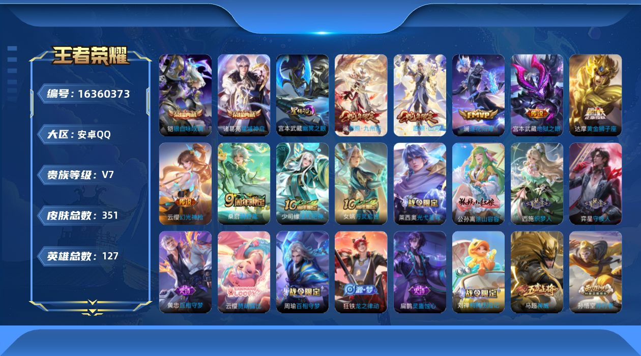 - [12073448]V7 12传说 125英雄 220皮肤 可修改实名 优质装备:黄金射手座,云鹰飞将(小将军),一念神魔,仲夏夜之梦(大飞蛾),零号·赤焰,胖达荣荣,涂山容容 传说皮:乘龙·问璇玑(孙尚香年限),幻光神枪 珍宝阁皮:妄想食味 限定皮:愿照·岁时盈(虞姬年限),映山客,鸣野蒿,至尊宝,武陵仙君(小桃花),飞衡(韩信年限),高山流水,五谷丰年 史诗皮:苍鳞隐世,器灵·浮梦炉,化蝶舞,灵蛊蚀心,星界战将,龙之律动,石田雨龙,百相守梦-周瑜,茶境仙,怒海争锋,破空之剑,芈月浮光幕影,琥珀纪元伽罗,蔬乡物语(鲁班七号),百相守梦-百里守约,星界特工,百相守梦-黄忠,织梦人,紫霞仙子,特工魅影,千年之狐,江河有灵,雪夜绮愿(周瑜),百解令(蒙犽),高渐离燃音魔法,青蛇,猫狗日记-大乔,乱世虎臣,节奏热浪,修罗,女仆咖啡,摇滚巨星,水果甜心,绅士熊喵,星夜王子,心灵骇客,功夫厨神,暗隐猎兽者,幽灵船长,鬼剑武藏,心灵战警,纤云弄巧,拒霜思,缤纷独角兽,乘风破浪,逐浪之夏,曙光守护者,箭羽风息,金属风暴,鹰眼统帅,赏金猎手,无心,未来纪元-赵云