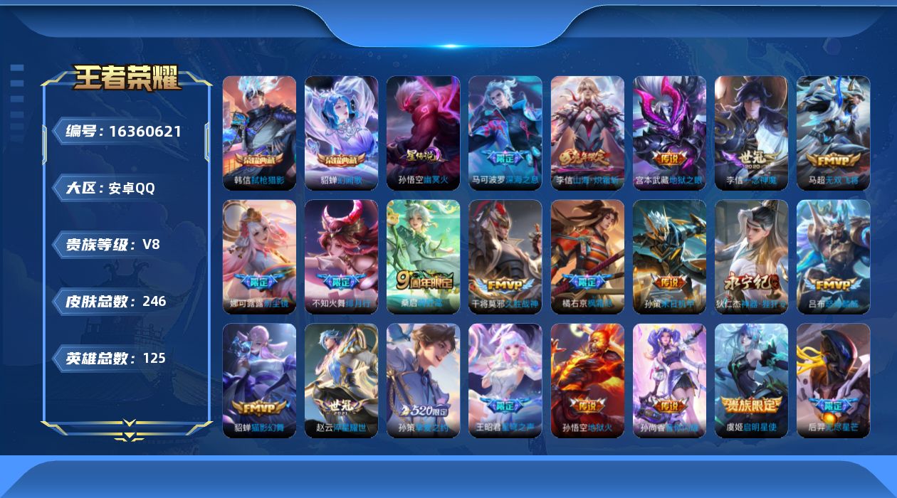 [16360621]【特价急出/详情看图】安卓Q-V8-永恒钻石V段位-125英雄-246皮肤-2典藏皮肤-1星元-22传说-71史诗