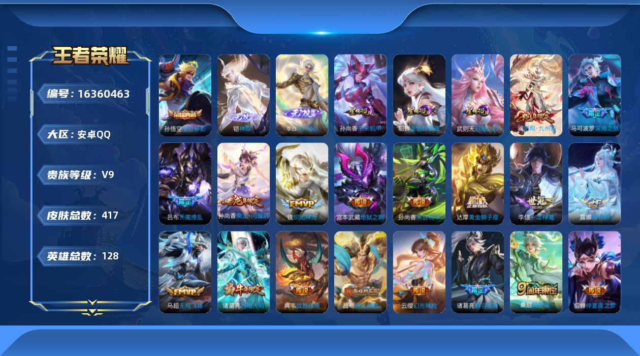 [16360463]可二次【店主推荐捡漏号!可直接换绑】安卓Q-V9-至尊星耀IV段位-128英雄-417皮肤-1典藏皮肤-2无双-4星元-31传说-125史诗