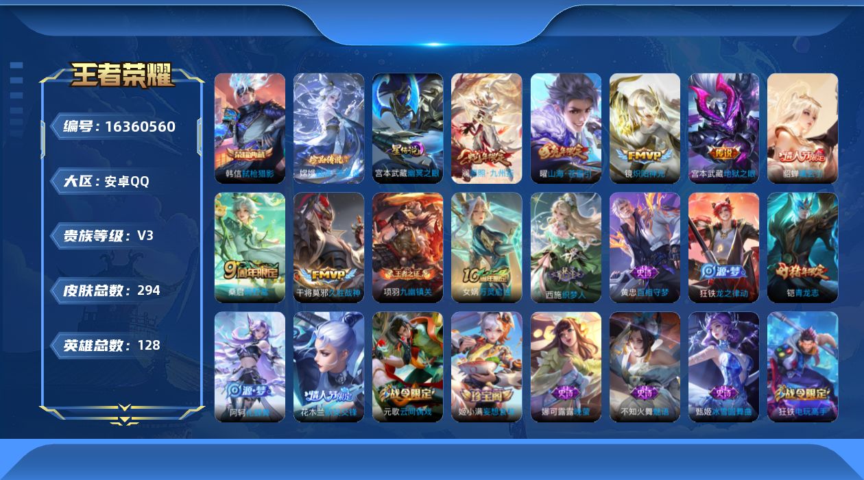 [16360560]【店主推荐捡漏号!可直接换绑 打野29段 3市标】安卓Q-V3-永恒钻石III段位-128英雄-294皮肤-1典藏皮肤-1珍品传说-1星传说-7传说-78史诗 【荣耀典藏】:韩信弑枪猎影 【珍品传说】:嫦娥器灵落星盏 【传说皮肤】:澜愿照九州拓,桑启鸣野蒿,貂蝉曦玄引,曜山海苍雷引,镜炽阳神光,干将莫邪久胜战神,宫本武藏地狱之眼 【限定皮肤】:蔡文姬夏日便利店,虞姬夏日便利店,姜子牙天穹之誓,杨戬破阵退雄兵,狄仁杰阴阳师,赵云皇家上将,庄周高山流水,高渐离玩趣恶龙,钟无艳王者之锤,钟无艳超时空战士,扁鹊奇幻香踪,白起夜都怪侠,芈月幻夜卜梦,元歌云间偶戏,元歌无心,甄姬游园惊梦,甄姬落雪兰心,狄仁杰魔术师,狄仁杰万华元夜,达摩沙漠行僧,项羽海滩派对,程咬金演武夺筹,王昭君午后时光,兰陵王金庭之子,花木兰默契交锋,亚瑟潮玩骑士王,后羿圣弓游侠,李元芳云中旅人,钟馗驱傩正仪,杨戬潮玩骑兵,女娲朔望之晖,干将莫邪真爱魔法,雅典娜黎明之约,鬼谷子原初探秘者,鬼谷子五谷丰年,黄忠火炮绅士,铠青龙志,苏烈千军破阵,百里玄策原初追逐者,梦奇顽趣,沈梦溪大漠名商,明世隐吟游魔法,裴擒虎李小龙,裴擒虎擒涛扼浪,狂铁电玩高手,云中君纤云弄巧,上官婉儿梁祝,嫦娥拒霜思,嫦娥暖冬兔眠,曜山海苍雷引,鲁班大师探海日志,桑启海盐诗旅,暃星界游侠,阿古朵江河有灵,张良古海寻踪,蒙犽百解令,蒙恬荣光圣徽,高渐离燃音魔法,妲己灵卜魔法,鬼谷子天穹祈灯,姬小满妄想食味,貂蝉曦玄引,百里玄策超元猎域,沈梦溪龙舞盛年,鲁班七号蔬乡物语,李元芳蔬乡物语,刘邦剑破天穹,程咬金群星魔术团,镜青焰无极,项羽苍威无极,刘备异域游侠,周瑜熔金海岸 【年限皮肤】:铠青龙志,曜山海苍雷引 【赛季限定】:狄仁杰万华元夜,达摩沙漠行僧,程咬金演武夺筹,兰陵王金庭之子,张良古海寻踪,李元芳云中旅人,钟馗驱傩正仪,雅典娜黎明之约,鬼谷子原初探秘者,苏烈千军破阵,百里玄策原初追逐者,梦奇顽趣,沈梦溪大漠名商,裴擒虎擒涛扼浪,鲁班大师探海日志,桑启海盐诗旅,鬼谷子天穹祈灯,蒙恬荣光圣徽,刘邦剑破天穹,姜子牙天穹之誓 【战令限定】:蔡文姬夏日便利店,虞姬夏日便利店,钟无艳超时空战士,扁鹊奇幻香踪,白起夜都怪侠,芈月幻夜卜梦,元歌云间偶戏,甄姬落雪兰心,王昭君午后时光,亚瑟潮玩骑士王,后羿圣弓游侠,杨戬潮玩骑兵,女娲朔望之晖,干将莫邪真